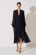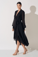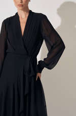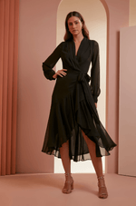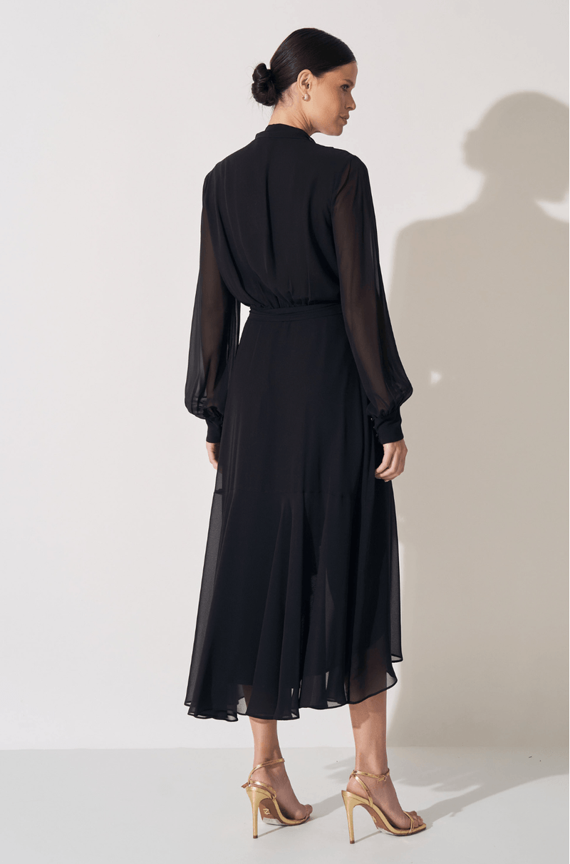 Vestido midi em chiffon que traz transparência e leveza. Decote V transpassado com pregas nos ombros e gola criando lindo caimento. As mangas longas bufantes com punho trazem um toque de transparência delicada. Saia midi com transpasse e babado assimétrico trazendo movimento fluido ao caminhar. É o modelo versátil para usar em compromissos diurnos ou noturnos, apenas mudando os acessórios.