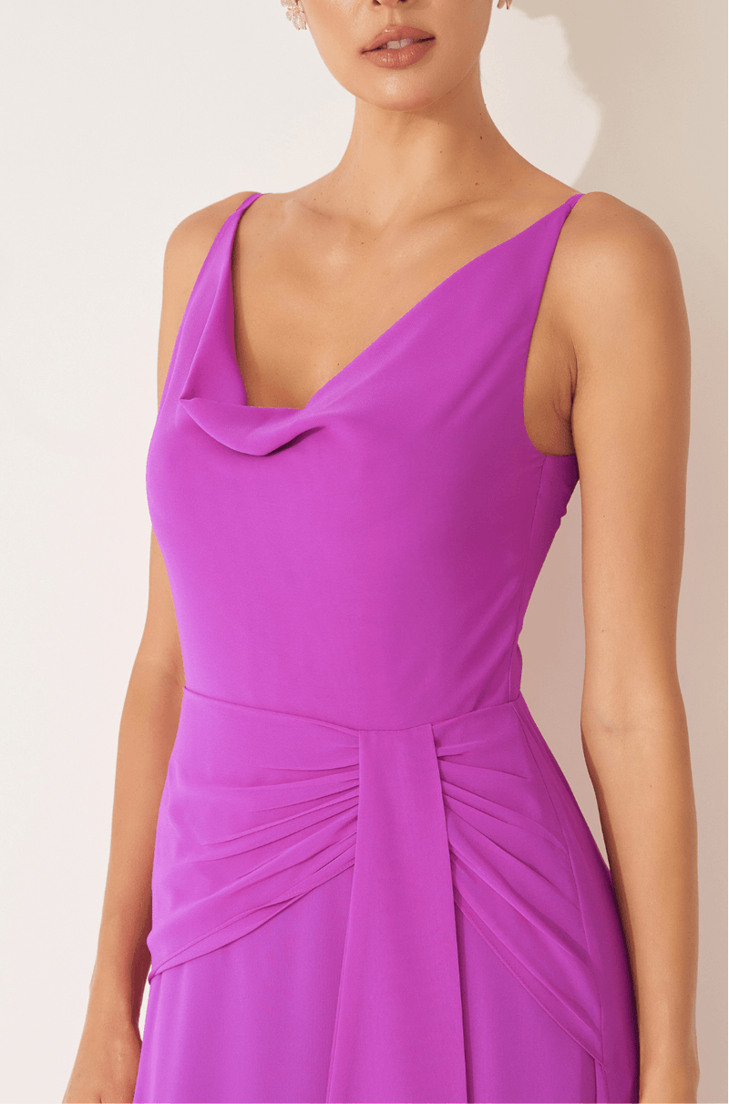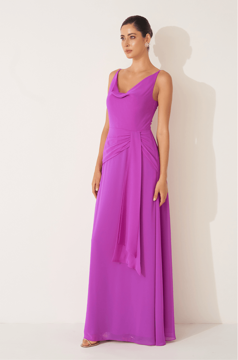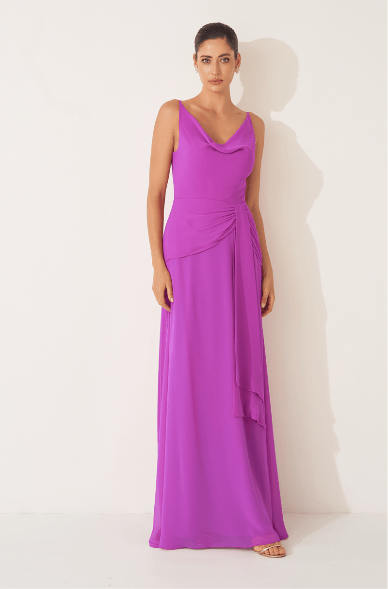 Este vestido longo em chiffon leve destaca-se pelo caimento fluido e elegante, perfeito para ocasiões que pedem delicadeza e sofisticação. O decote degagê valoriza o colo com um toque de requinte, enquanto a cintura marcada pelo franzido no quadril cria uma silhueta feminina e harmoniosa.