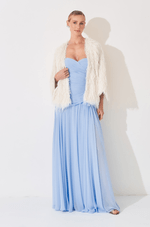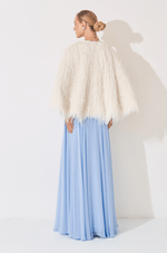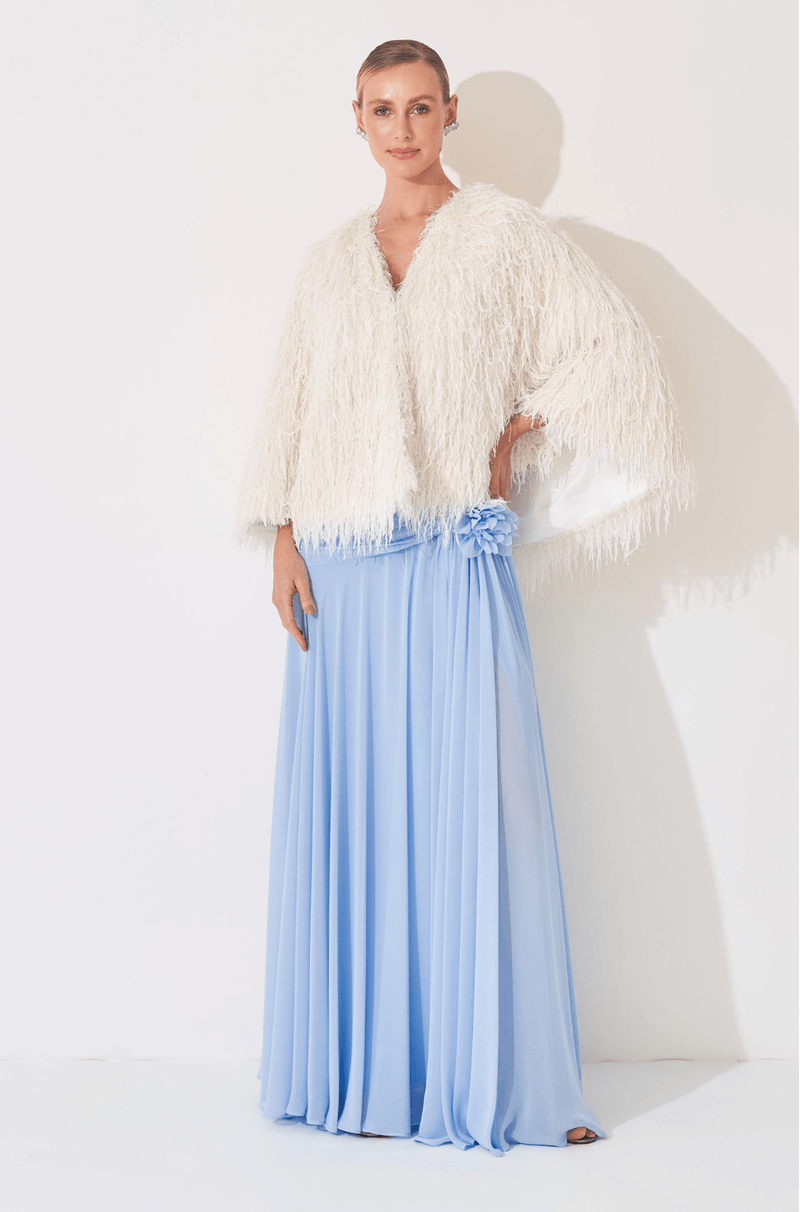 Capa em plumas com caimento leve e efeito imponente, perfeita para transformar qualquer produção em um momento memorável. Aberta na frente, possui fechamento frontal por ganchos discretos no centro da peça, garantindo praticidade sem interferir na estética sofisticada. A textura das plumas cria movimento e presença, elevando vestidos e macacões com um toque glamouroso e fashionista. Ideal para festas noturnas, eventos especiais e produções que pedem impacto.