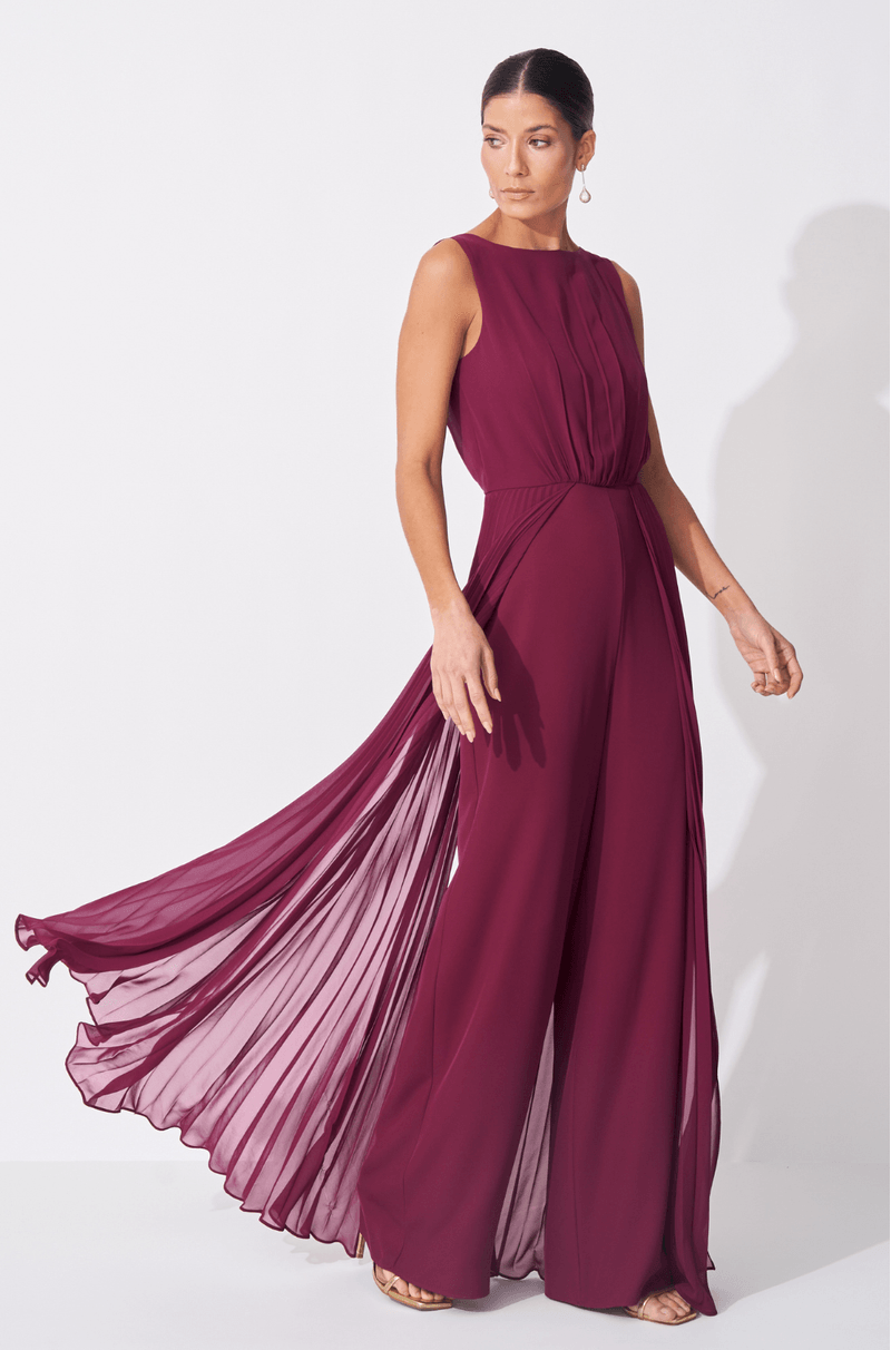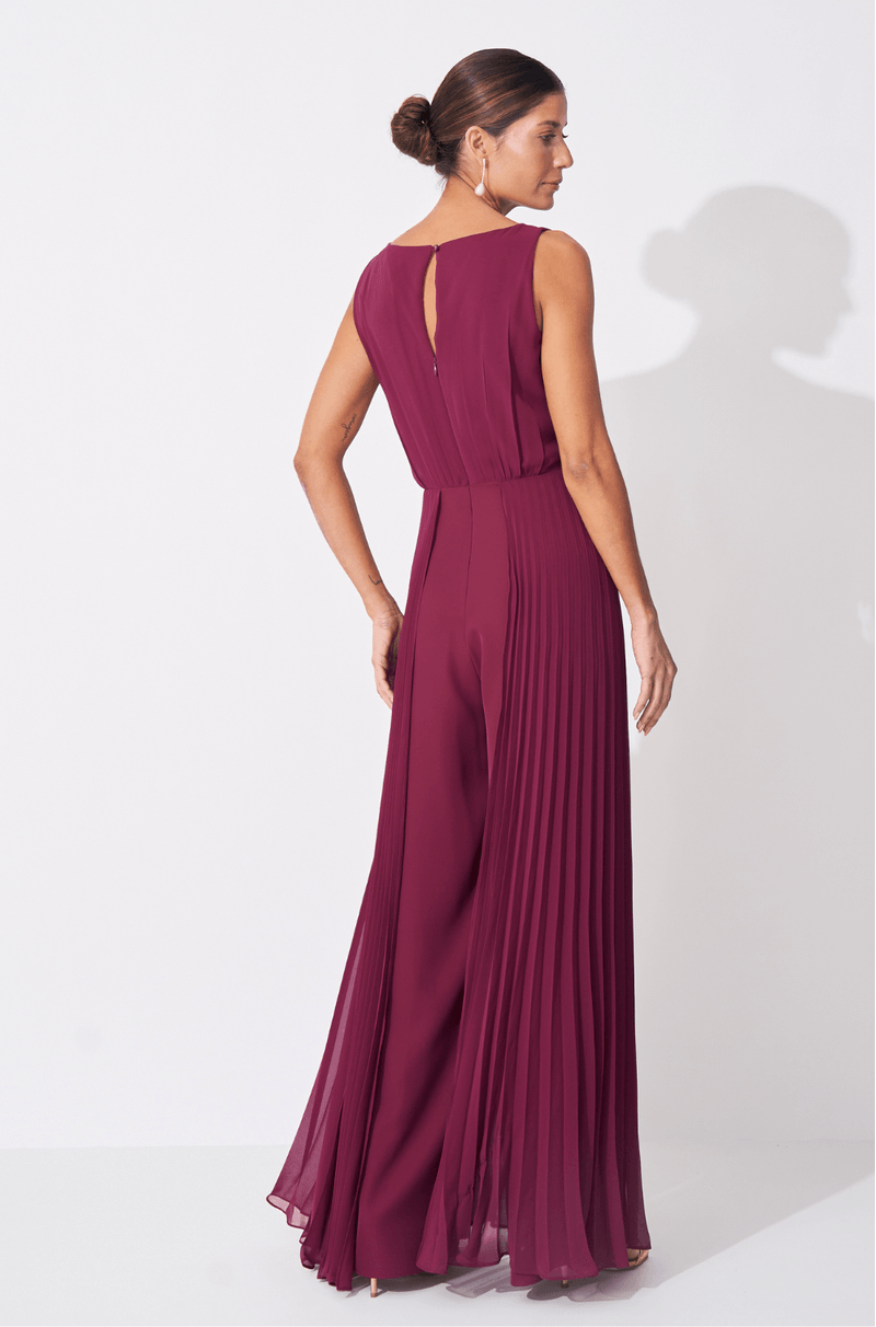 Macacão em crepe alfaiataria com toque leve e sobreposição em chiffon que traz movimento e fluidez. O decote canoa valoriza o colo e recebe leve franzido na cintura frontal, também presente nas costas em chiffon. A calça pantalona, feita em crepe encorpado, tem caimento sofisticado e detalhe de chiffon plissado nas laterais, criando contraste sutil de texturas. Nas costas, abertura em gota com botão personalizado e zíper invisível finalizam o visual com delicadeza. Ideal para ocasiões que pedem elegância descomplicada, como aniversários, jantares ou batizados.