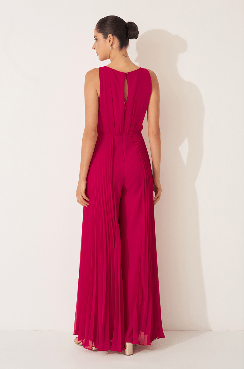 Macacão em crepe alfaiataria com toque leve e sobreposição em chiffon que traz movimento e fluidez. O decote canoa valoriza o colo e recebe leve franzido na cintura frontal, também presente nas costas em chiffon. A calça pantalona, feita em crepe encorpado, tem caimento sofisticado e detalhe de chiffon plissado nas laterais, criando contraste sutil de texturas. Nas costas, abertura em gota com botão personalizado e zíper invisível finalizam o visual com delicadeza. Ideal para ocasiões que pedem elegância descomplicada, como aniversários, jantares ou batizados.
