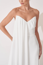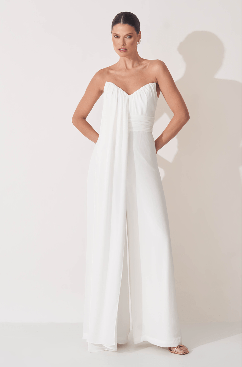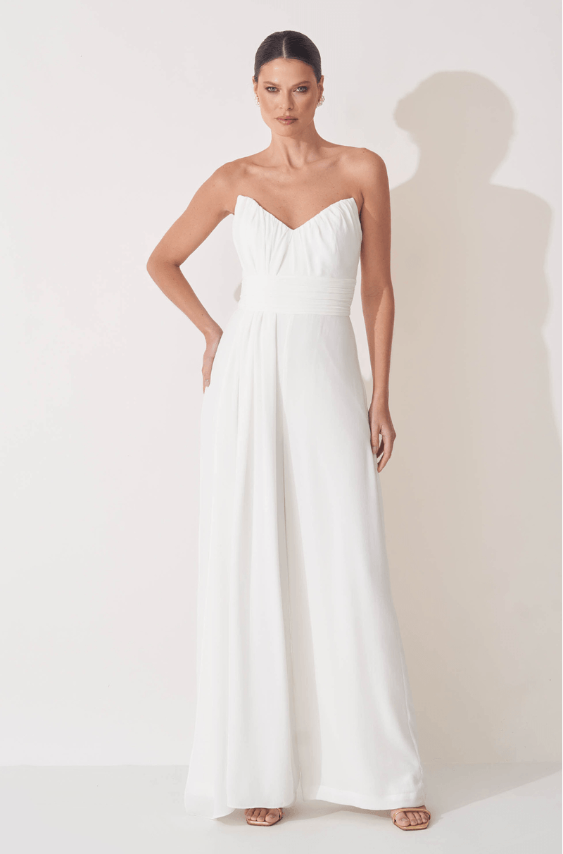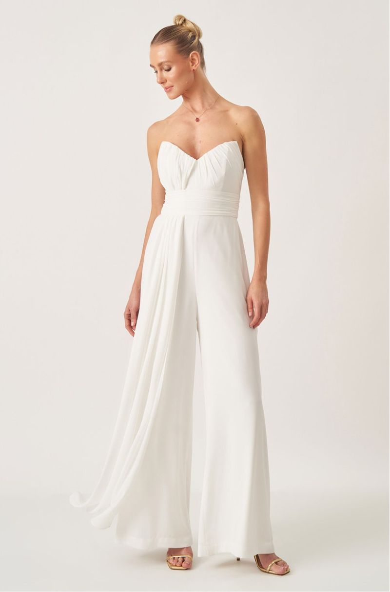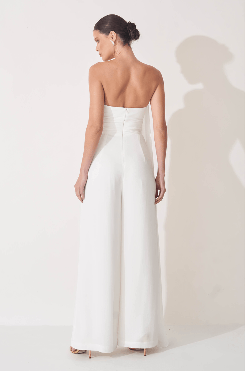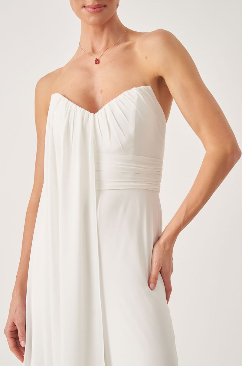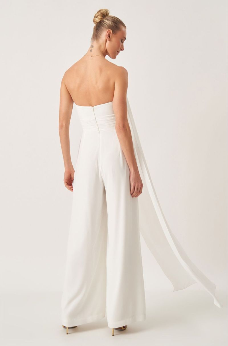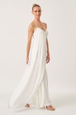 Macacão de chiffon com calça reta e caimento leve. O busto sem alças tem detalhe franzido que valoriza o colo, enquanto a faixa solta na frente garante versatilidade ao styling, podendo ser usada por baixo ou por cima do franzido na cintura, criando diferentes propostas de uso. Uma peça prática e elegante, perfeita para quem busca conforto com informação de moda para coquetéis, festas e outros eventos sofisticados.