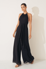 Macacão longo em chiffon leve, com caimento fluido que acompanha os movimentos com leveza e elegância. O decote frente única, delicadamente franzido, fecha-se no pescoço com botão personalizado, revelando um visual contemporâneo e sofisticado. A cintura marcada com faixa fixa valoriza as curvas e dá origem a uma cascata de tecido que se prolonga sobre a calça pantalona, criando um efeito alongador e harmonioso. O fechamento posterior com zíper invisível garante acabamento impecável e discreto.