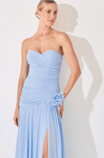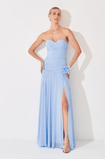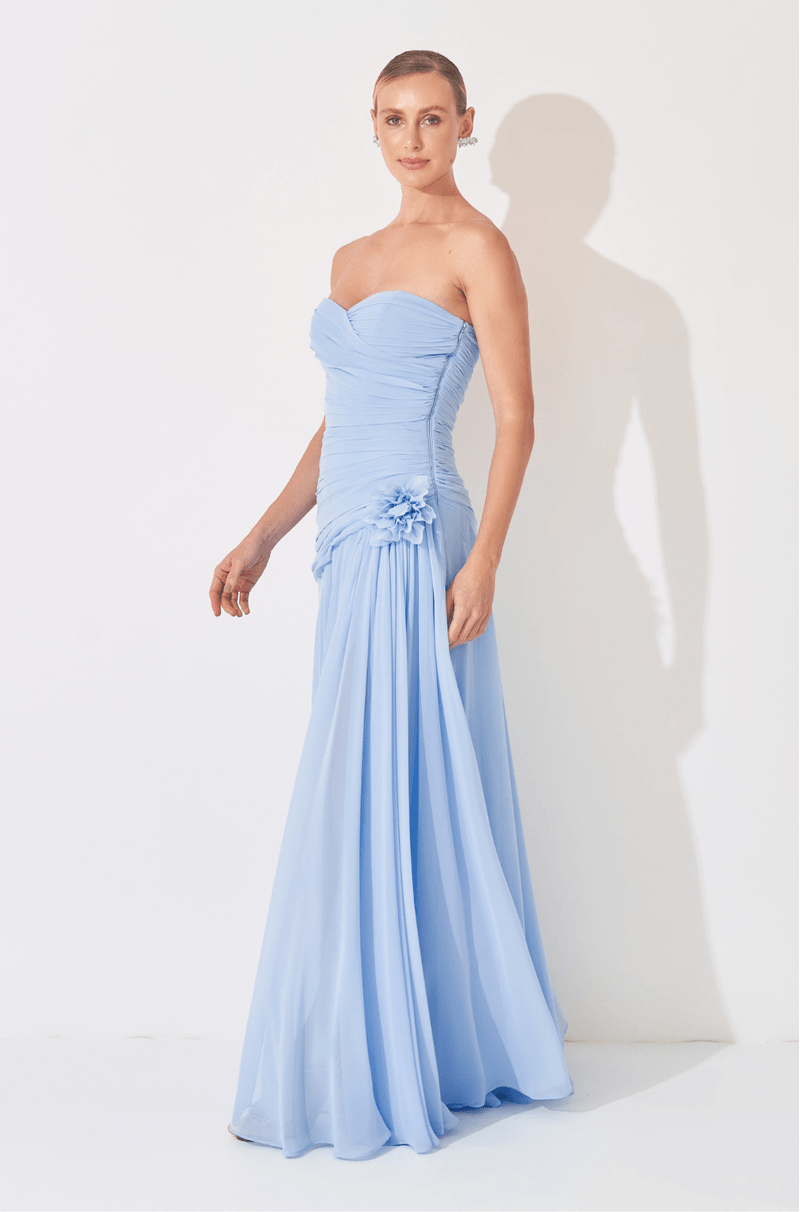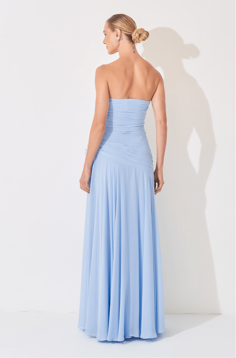 Descubra a sofisticação deste vestido longo confeccionado em chiffon leve e fluido, que desenha delicadamente a silhueta com caimento impecável. O decote sem alças, transpassado e franzido, cria um visual envolvente e elegante, estendendo-se do busto à cintura por meio de um recorte diagonal que valoriza o corpo com sutileza. A saia solta apresenta franzido na cintura e uma fenda frontal, proporcionando movimento marcante e um toque de sensualidade em cada passo. Para complementar, o vestido acompanha um broche de flor removível, adicionando um charme romântico e versátil ao look. Ideal para casamentos ao ar livre, festas de verão e ocasiões que exigem leveza e elegância, este vestido longo em chiffon é a escolha perfeita para mulheres que desejam um visual sofisticado e delicado.
