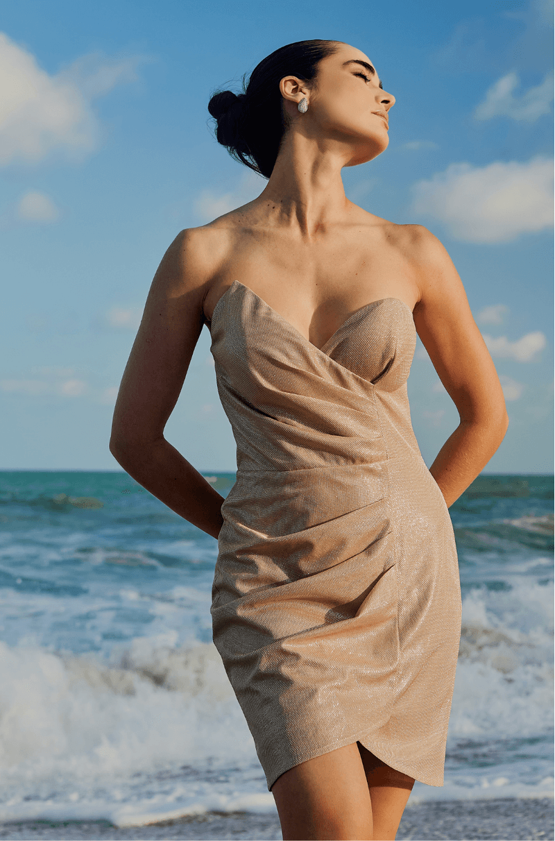 O decote assimétrico, sem alças, destaca o colo com modernidade e equilíbrio. As pregas estrategicamente posicionadas no busto, cintura e quadril esculpem as curvas com delicadeza, proporcionando conforto e elegância. A saia transpassada adiciona movimento à peça e um toque sensual na medida certa.