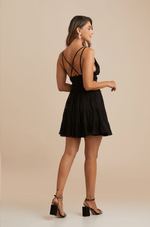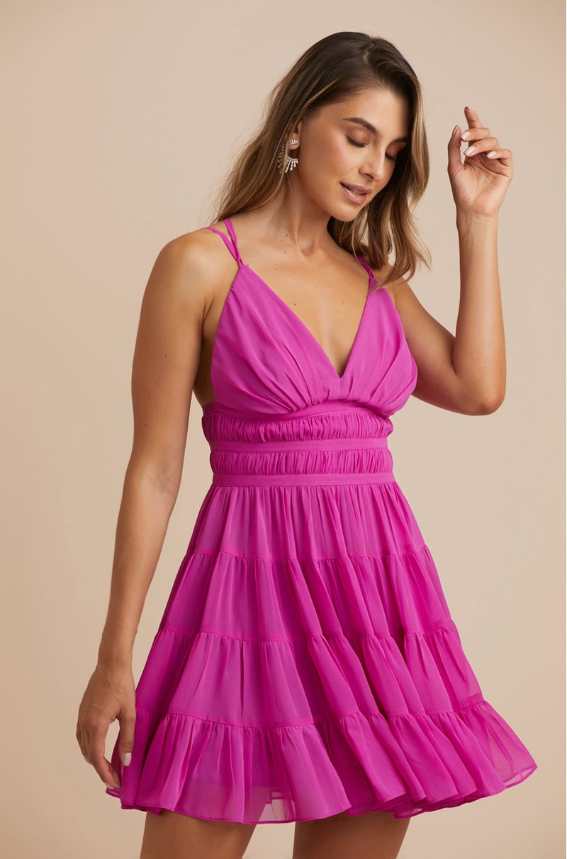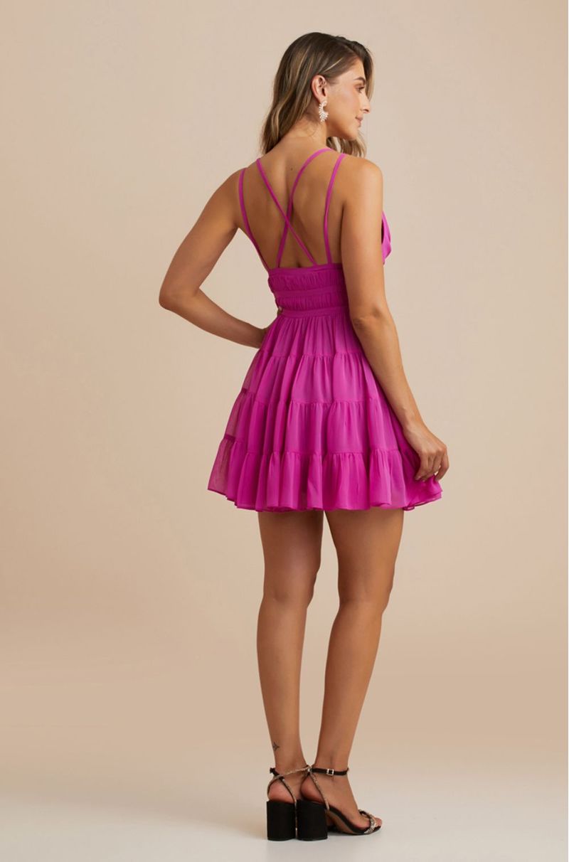 Vestido curto em tecido leve e esvoaçante, com recortes e franzidos que criam movimento e fluidez. Decote V delicado com acabamento franzido. Costas à mostra com alças finas cruzadas que formam um desenho elegante. Detalhe na cintura valoriza a silhueta e garante caimento impecável. Ideal para eventos ao ar livre, festas de verão ou celebrações durante o dia.