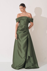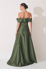 Este vestido longo em zibeline une estrutura e sofisticação, criando um visual imponente e elegante. O decote ombro a ombro, complementado por uma pala clássica, confere um toque atemporal e refinado ao design. Nas costas, o zíper invisível mantém o caimento perfeito, garantindo conforto e acabamento impecável.