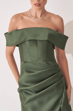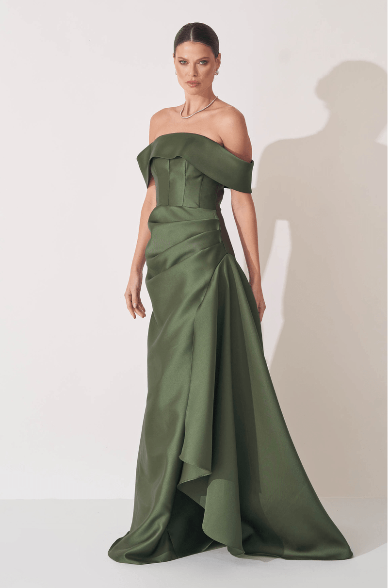 A cintura marcada com barbatanas valoriza a silhueta com elegância, enquanto a saia sereia apresenta pregas laterais no quadril e um godê que forma um efeito cascata em movimento, destacando-se pela fluidez e charme.