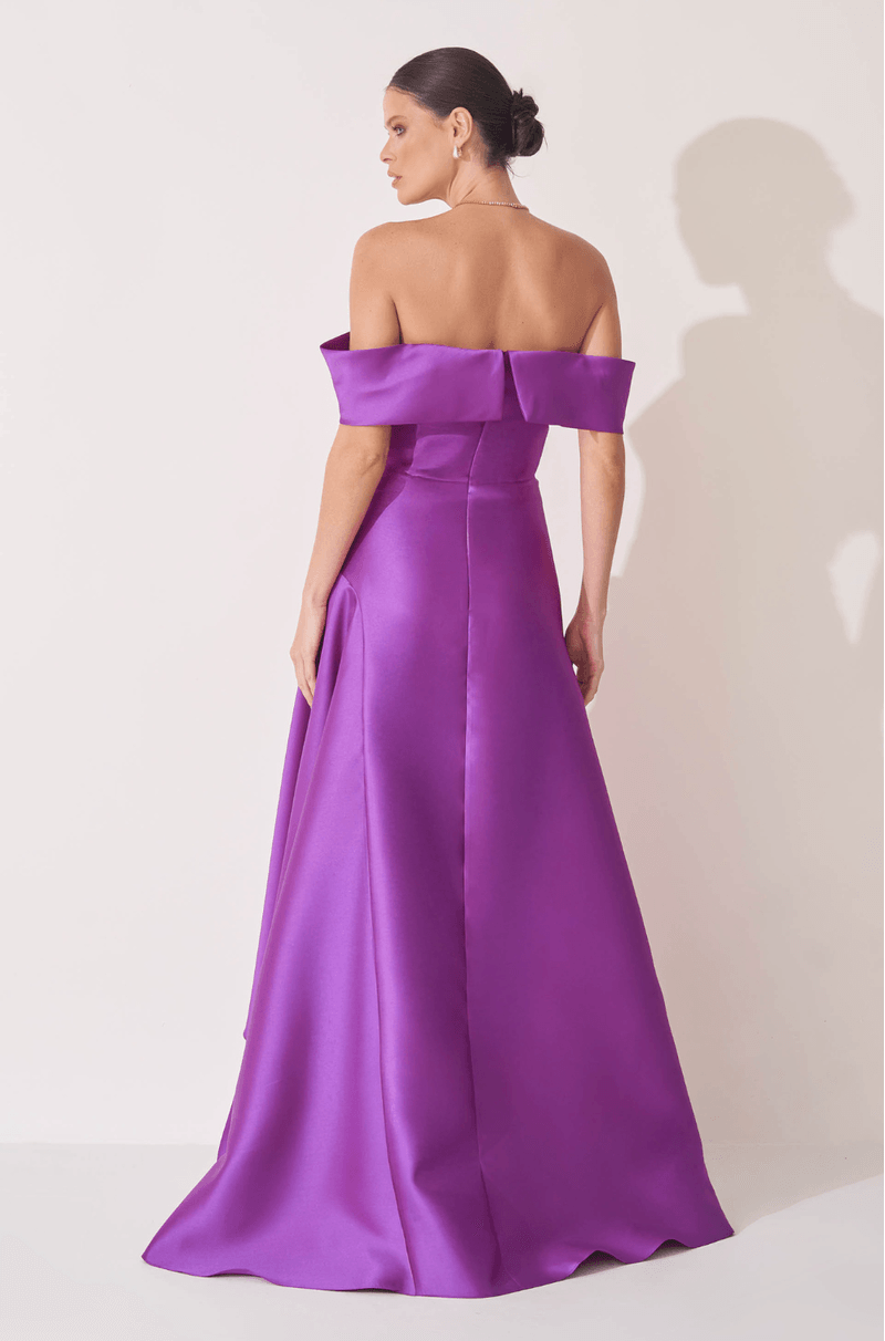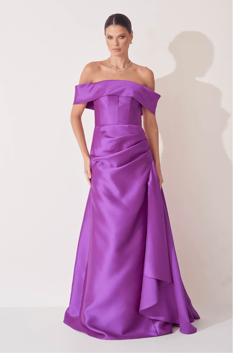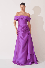 Este vestido longo em zibeline une estrutura e sofisticação, criando um visual imponente e elegante. O decote ombro a ombro, complementado por uma pala clássica, confere um toque atemporal e refinado ao design. Nas costas, o zíper invisível mantém o caimento perfeito, garantindo conforto e acabamento impecável.
