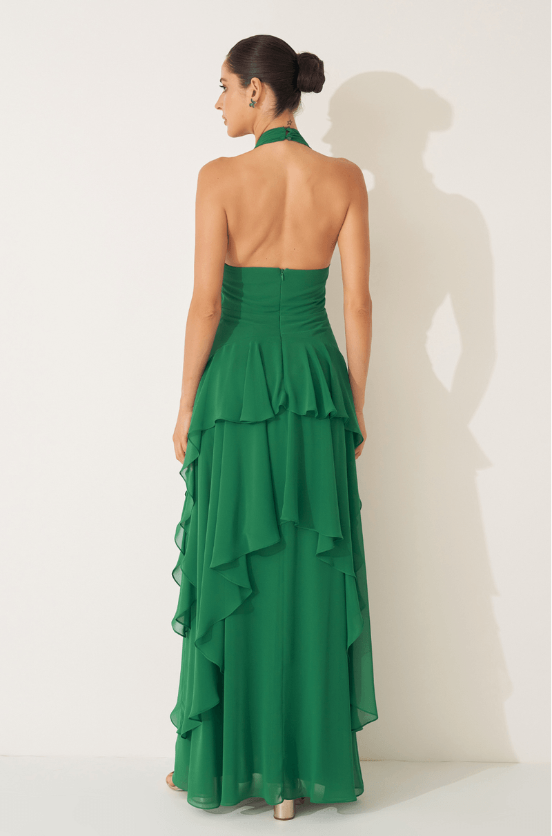 O vestido longo em chiffon é a expressão perfeita de leveza e elegância. Com caimento fluido e toque suave, ele cria um visual delicado e sofisticado, ideal para ocasiões especiais. O decote frente única com franzido no busto valoriza o colo com sutileza, enquanto os botões personalizados nas costas acrescentam um charme exclusivo e refinado. O recorte arredondado no quadril destaca a silhueta de forma elegante, e a saia em camadas com babados proporciona movimento e romantismo a cada passo. O fechamento por zíper invisível no centro das costas garante um acabamento limpo e confortável. Perfeito para madrinhas, formandas e convidadas de casamento, esse modelo combina feminilidade, sofisticação e personalidade, resultando em uma produção inesquecível. Detalhes da peça: - Tecido chiffon - Decote frente única com franzido no busto - Botões personalizados nas costas - Recorte arredondado no quadril - Saia em camadas com babados - Fechamento em zíper invisível no centro das costas #DicaAmiga: Combine com brincos longos e penteado preso para destacar o decote e os detalhes das costas. Aposte em sandálias de tiras finas para um look ainda mais elegante.