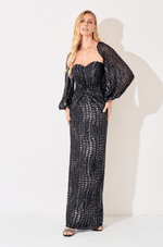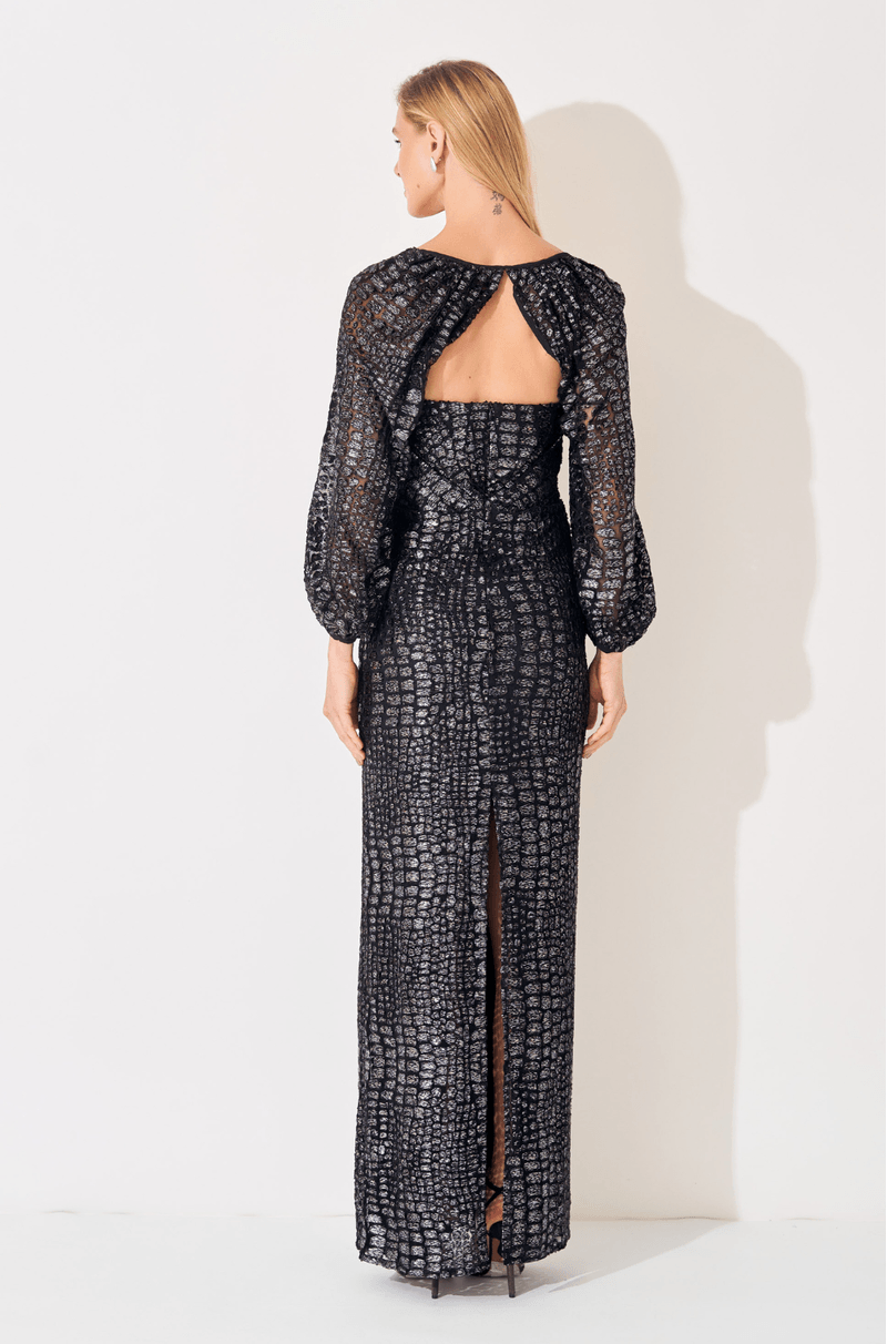 O tecido trabalhado em textura sofisticada confere profundidade visual à peça, refletindo a luz de forma sutil e elegante. As mangas longas amplas, confeccionadas em material levemente translúcido, equilibram sensualidade e sofisticação, trazendo leveza ao visual e um charme extra ao design. O comprimento longo alonga a silhueta e reforça a proposta glamourosa do vestido.