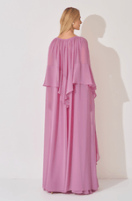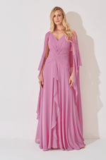 Este vestido longo em chiffon traduz leveza e sofisticação em uma proposta fluida e marcante. O decote em V com franzido no centro do busto valoriza o colo com delicadeza, criando um visual feminino e elegante. O recorte com franzido no quadril define a silhueta de forma natural, acompanhando o corpo com suavidade. O destaque da peça fica por conta do babado em cascata que parte do centro da cintura e se estende até o comprimento da saia, trazendo movimento, fluidez e um toque romântico ao caminhar. A capa longa removível complementa o design com imponência e versatilidade: seus recortes e babados iniciam na manga, contornam as costas e descem até a barra do vestido, criando um efeito sofisticado e envolvente. O fechamento em zíper invisível no centro das costas garante acabamento limpo e refinado. Uma peça pensada para ocasiões especiais que pedem presença, elegância e charme atemporal. Detalhes da peça: - Confeccionado em chiffon - Decote V franzido no centro do busto - Recorte e franzido no quadril - Babado em cascata no centro da cintura até o comprimento da saia - Capa removível #DicaAmiga: Use a capa para eventos mais formais ou quando quiser um visual impactante e cheio de movimento. Sem a capa, o vestido ganha uma leitura mais leve e romântica. Aposte em sandálias de salto fino e acessórios delicados para não competir com os babados. Um penteado preso ou semi-preso ajuda a valorizar o decote e deixa o look ainda mais sofisticado.