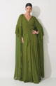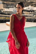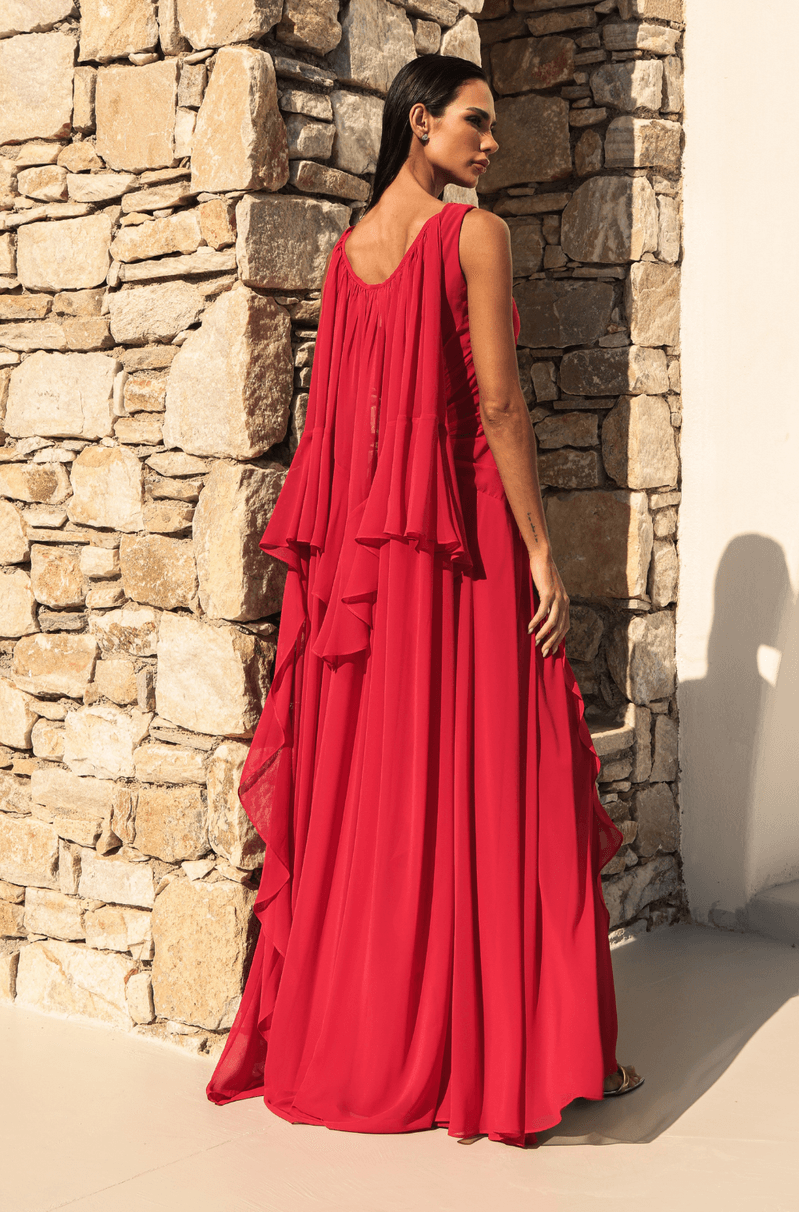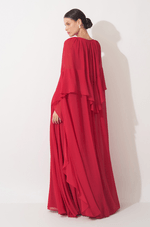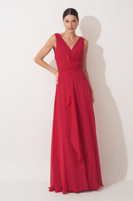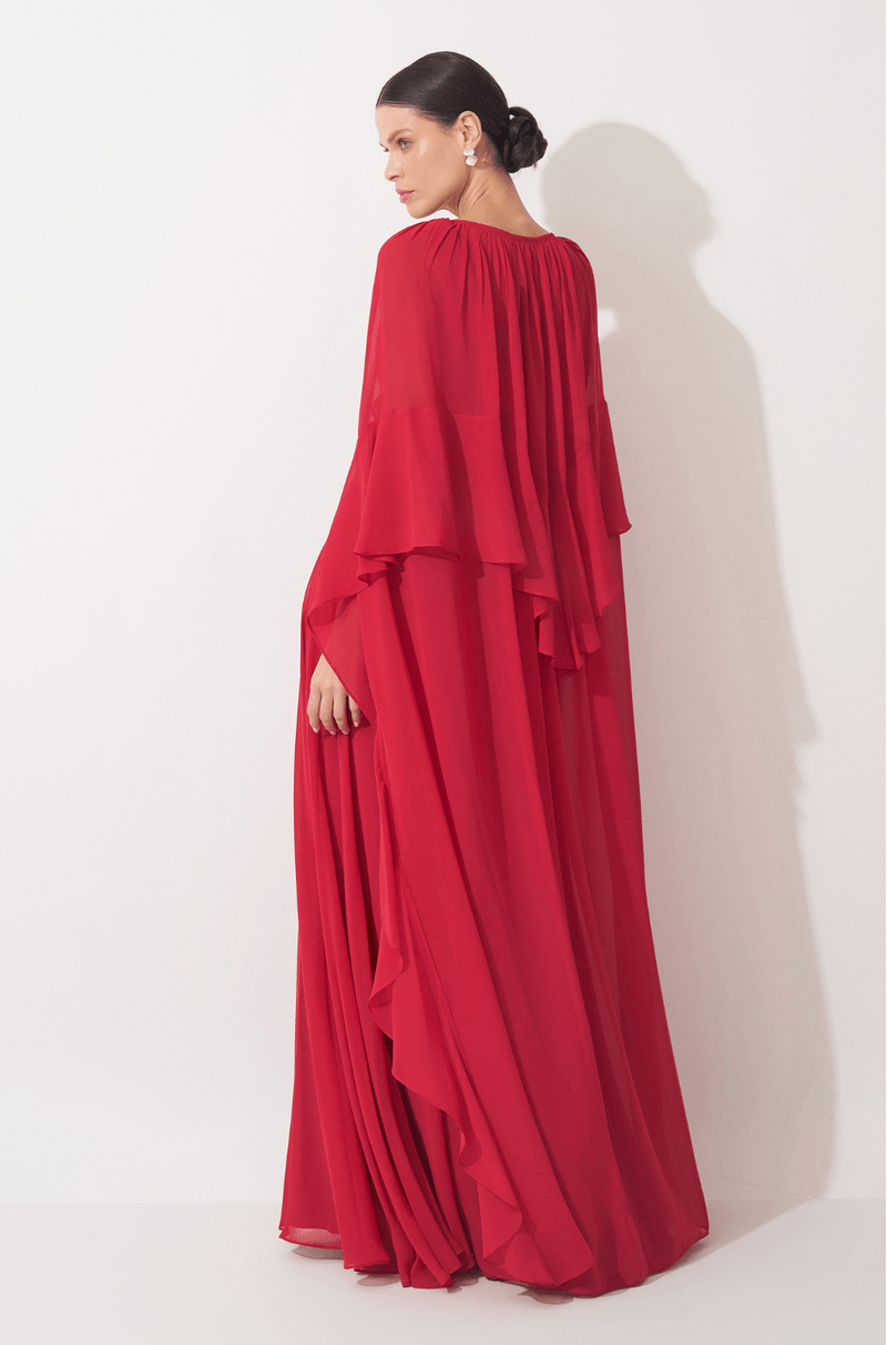 Este vestido longo em chiffon traduz leveza e sofisticação em uma proposta fluida e marcante. O decote em V com franzido no centro do busto valoriza o colo com delicadeza, criando um visual feminino e elegante. O recorte com franzido no quadril define a silhueta de forma natural, acompanhando o corpo com suavidade. O destaque da peça fica por conta do babado em cascata que parte do centro da cintura e se estende até o comprimento da saia, trazendo movimento, fluidez e um toque romântico ao caminhar. A capa longa removível complementa o design com imponência e versatilidade: seus recortes e babados iniciam na manga, contornam as costas e descem até a barra do vestido, criando um efeito sofisticado e envolvente. O fechamento em zíper invisível no centro das costas garante acabamento limpo e refinado. Uma peça pensada para ocasiões especiais que pedem presença, elegância e charme atemporal. Detalhes da peça: - Confeccionado em chiffon - Decote V franzido no centro do busto - Recorte e franzido no quadril - Babado em cascata no centro da cintura até o comprimento da saia - Capa removível #DicaAmiga: Use a capa para eventos mais formais ou quando quiser um visual impactante e cheio de movimento. Sem a capa, o vestido ganha uma leitura mais leve e romântica. Aposte em sandálias de salto fino e acessórios delicados para não competir com os babados. Um penteado preso ou semi-preso ajuda a valorizar o decote e deixa o look ainda mais sofisticado.