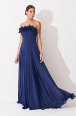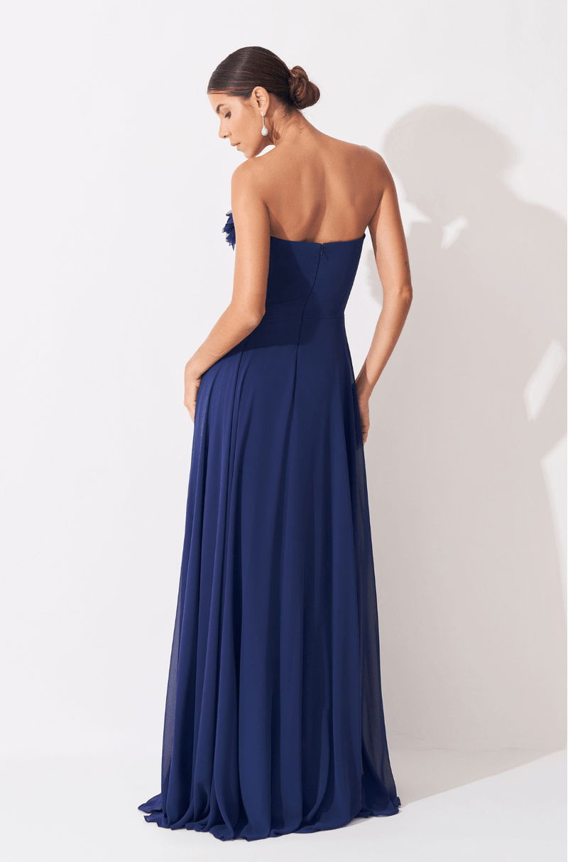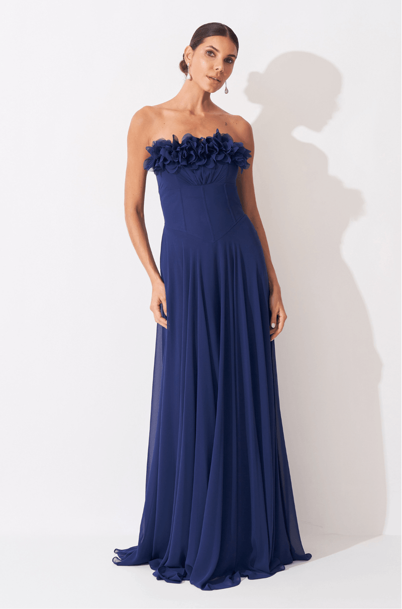 A cintura estruturada com barbatanas pespontadas valoriza a silhueta com precisão e conforto, criando um caimento impecável. Já a saia fluida e rodada confere movimento gracioso a cada passo, reforçando a sensação de leveza do chiffon. O fechamento em zíper invisível no centro das costas garante acabamento limpo e elegante, tornando este vestido uma escolha refinada para ocasiões especiais que pedem charme e sofisticação.