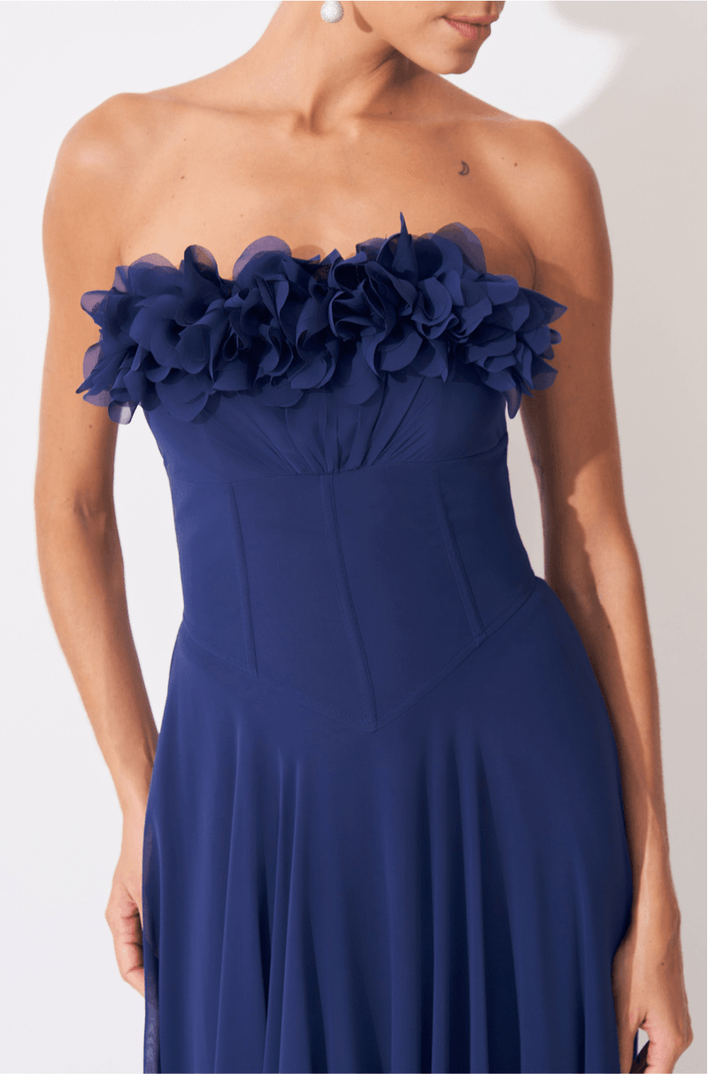 #DicaAmiga: Para manter a elegância da peça, escolha acessórios delicados e minimalistas ¿ brincos pequenos ou médios e uma clutch clean funcionam perfeitamente. Sandálias de salto fino ajudam a alongar a silhueta e acompanham o movimento da saia. Se quiser um toque extra de charme, aposte em um penteado leve, como ondas soltas ou coque baixo, que valorizam o decote e o detalhe da flor.