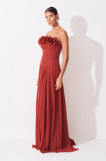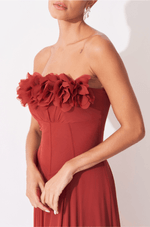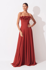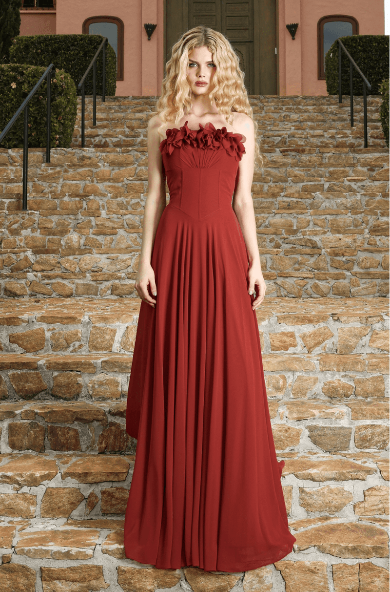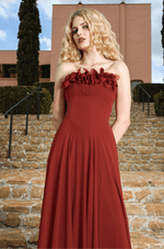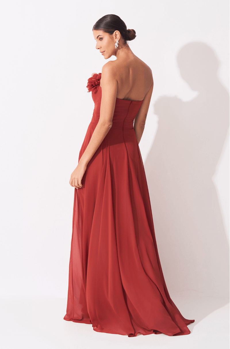 A cintura estruturada com barbatanas pespontadas valoriza a silhueta com precisão e conforto, criando um caimento impecável. Já a saia fluida e rodada confere movimento gracioso a cada passo, reforçando a sensação de leveza do chiffon. O fechamento em zíper invisível no centro das costas garante acabamento limpo e elegante, tornando este vestido uma escolha refinada para ocasiões especiais que pedem charme e sofisticação.