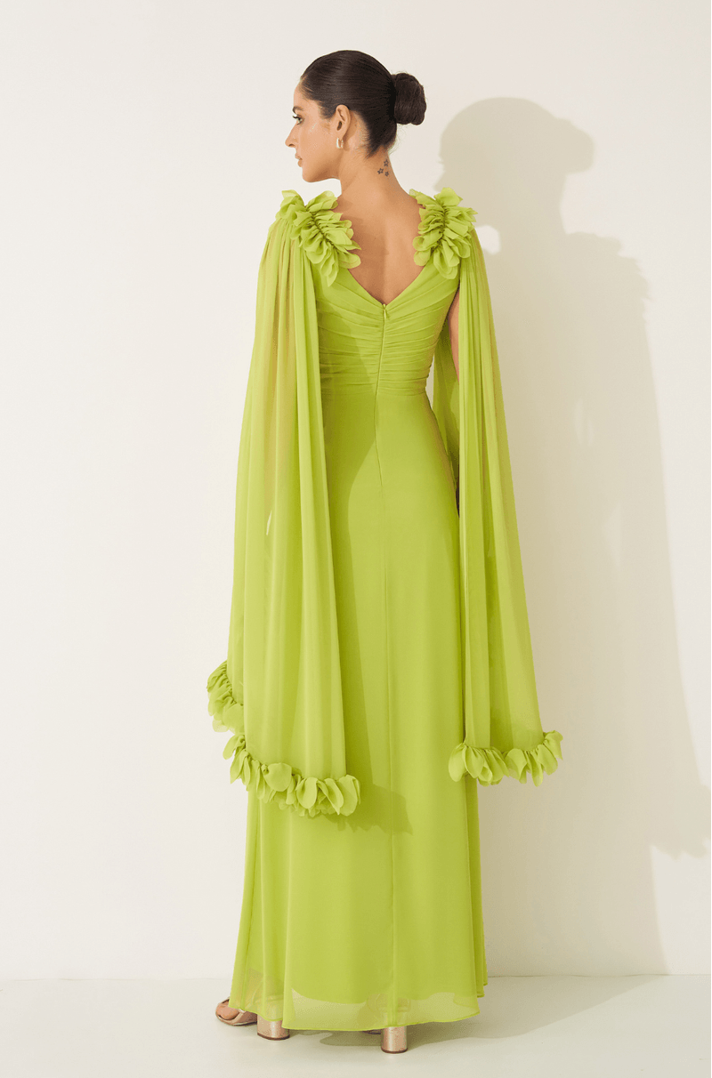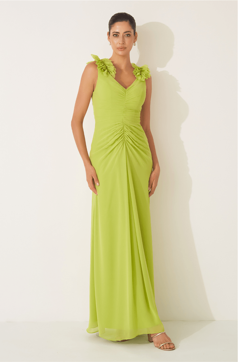 Encante com a fluidez e o romantismo do vestido longo em chiffon, um modelo que combina caimento leve, movimento gracioso e detalhes delicados. O decote em V com franzido no busto valoriza o colo com suavidade, enquanto o decote traseiro em V repete o charme de forma equilibrada.