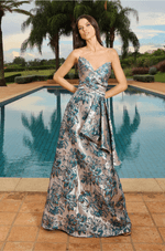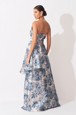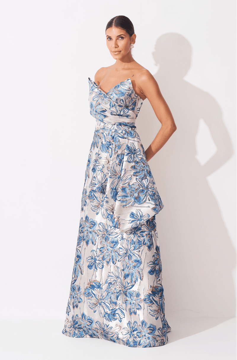 Vestido longo em tecido jacquard, estruturado e elegante, que imprime presença com sua textura rica e acabamento sofisticado. O decote sem alças traz o busto com um lado enviesado em forma de laço e o outro com pregas, criando um efeito assimétrico moderno que valoriza o colo. A cintura é marcada de forma sutil, equilibrando a estrutura do tecido com feminilidade. A saia evasê ganha faixa assimétrica que forma delicados canudos partindo da cintura e remetendo a uma sobreposição lateral, adicionando movimento e design à peça. Ideal para eventos formais, casamentos noturnos e produções que pedem impacto com elegância.