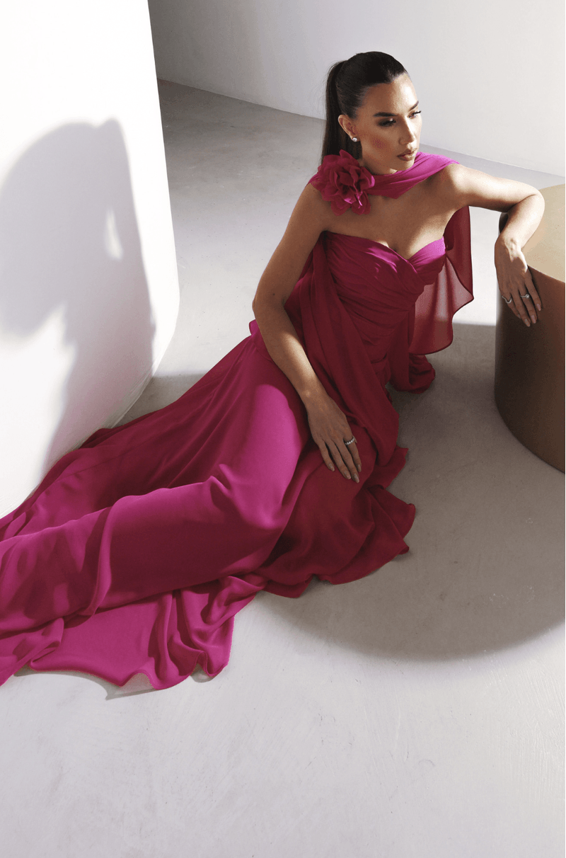 A saia solta apresenta franzido na cintura e uma fenda frontal, proporcionando movimento marcante e um toque de sensualidade em cada passo. Para complementar, o vestido acompanha um broche de flor removível, adicionando um charme romântico e versátil ao look.