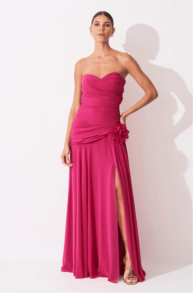 PRAZO DE PRODUÇÃO: 30 DIAS ÚTEIS + PRAZO DE ENTREGA Descubra a sofisticação deste vestido longo confeccionado em chiffon leve e fluido, que desenha delicadamente a silhueta com caimento impecável. O decote sem alças, transpassado e franzido, cria um visual envolvente e elegante, estendendo-se do busto à cintura por meio de um recorte diagonal que valoriza o corpo com sutileza. A saia solta apresenta franzido na cintura e uma fenda frontal, proporcionando movimento marcante e um toque de sensualidade em cada passo. Para complementar, o vestido acompanha um broche de flor removível, adicionando um charme romântico e versátil ao look. Ideal para casamentos ao ar livre, festas de verão e ocasiões que exigem leveza e elegância, este vestido longo em chiffon é a escolha perfeita para mulheres que desejam um visual sofisticado e delicado. Detalhes da peça: - Vestido longo - Tecido chiffon - Decote sem alças transpassado - Franzido do busto à cintura com recorte diagonal - Saia com franzido e fenda frontal - Broche de flor removível - Zíper invisível na lateral - Não acompanha capa. #DicaAmiga: Combine com cabelo solto e acessórios em tons naturais para um visual leve e encantador.