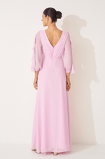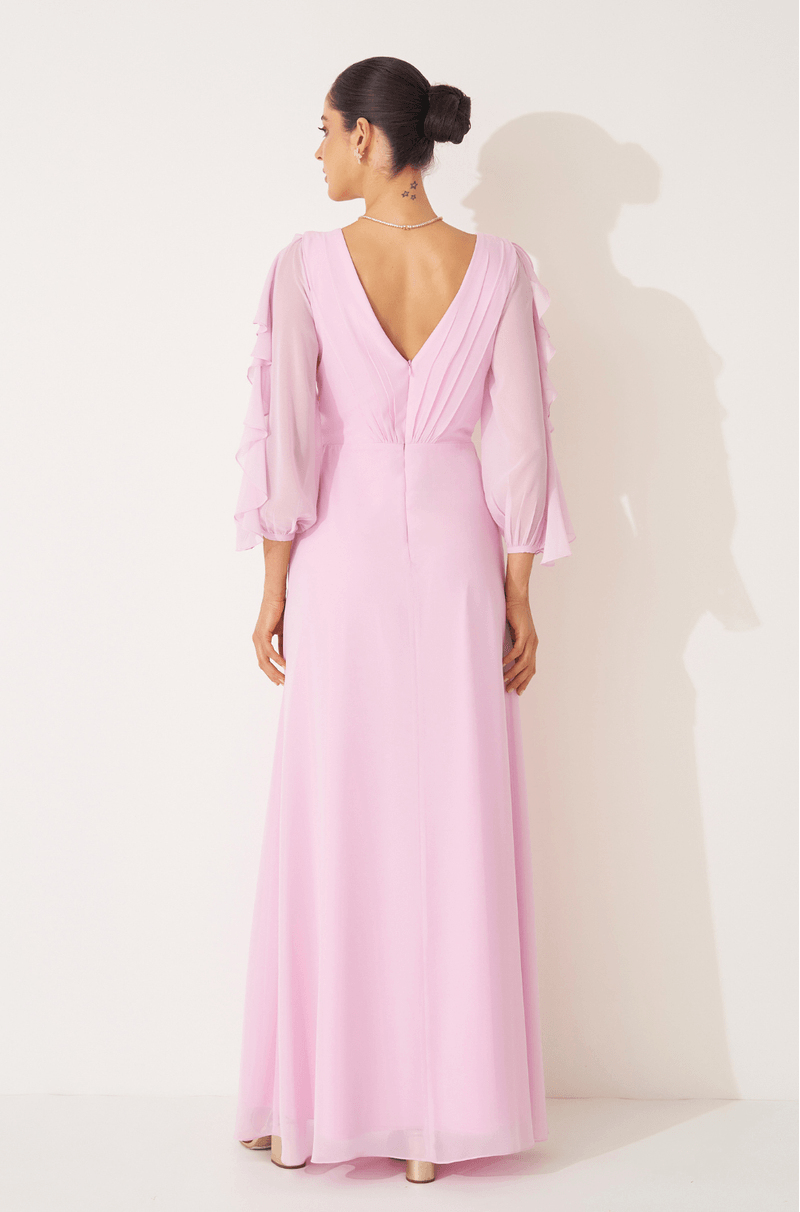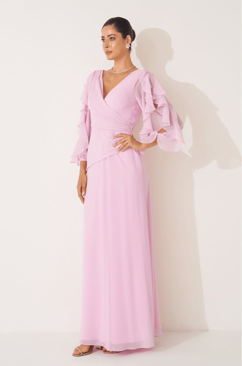 Delicado, fluido e envolvente, este vestido longo em chiffon é a escolha perfeita para ocasiões que pedem romantismo contemporâneo aliado à sofisticação atemporal. Sua construção leve e seus detalhes marcantes criam uma silhueta feminina, elegante e memorável ¿ ideal para casamentos ao pôr do sol, festas em jardins ou eventos formais com atmosfera poética. O decote transpassado é valorizado por um franzido lateral sutil, que destaca o busto de forma natural e elegante. Já o decote V nas costas, com acabamento levemente franzido, traz charme e equilíbrio ao visual. As mangas longas bufantes com babados delicados e recortes vazados adicionam impacto visual e movimento, criando um contraste encantador entre estrutura e leveza. A saia evasê com recorte no quadril complementa a peça com fluidez e feminilidade, enquanto o fechamento em zíper invisível garante caimento impecável. Detalhes da peça: - Tecido leve e sofisticado em chiffon - Decote transpassado com franzido lateral no busto - Decote V nas costas, com leve franzido - Mangas bufantes longas, com babados e recortes estratégicos - Saia evasê com recorte no quadril, que valoriza o caimento - Zíper invisível nas costas, para ajuste refinado #DicaDeAmiga: Realce o visual com brincos delicados e sandálias metalizadas para um toque de brilho sutil. Finalize com uma maquiagem glow e cabelos soltos em ondas leves para um look digno de contos modernos.