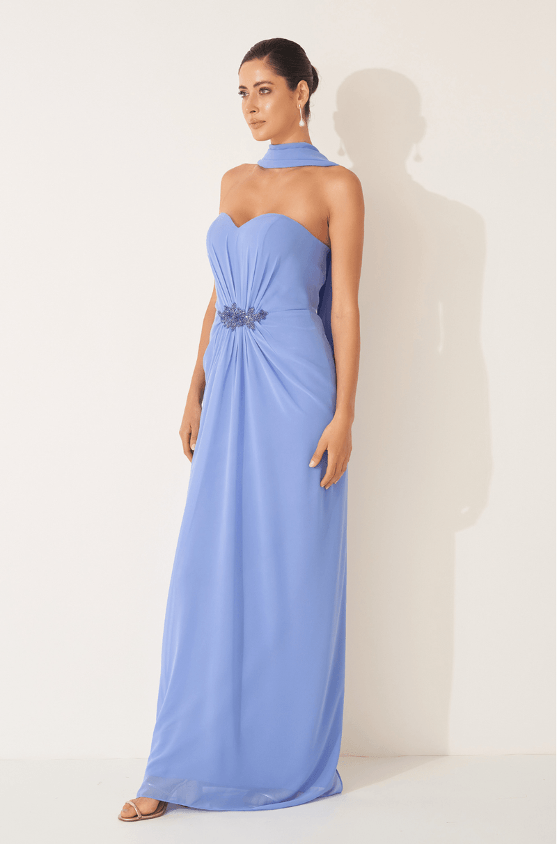 Um vestido longo que une elegância etérea e sofisticação em chiffon leve. O decote coração sem alças valoriza o colo com delicadeza, enquanto o franzido central na cintura, combinado com o bordado de vidrilhos, acrescenta um brilho sutil e requintado. O drapeado estratégico no quadril alonga a silhueta, e a saia reta com fenda traseira proporciona movimento moderno e fluido ao caminhar. Para complementar, a peça acompanha uma echarpe com costura multifuncional, permitindo diferentes formas de styling para variadas ocasiões. Perfeito para casamentos diurnos ou noturnos, formaturas e eventos que pedem um toque de glamour sofisticado. Detalhes da peça: - Comprimento longo em chiffon - Decote coração sem alças - Franzido na cintura com bordado em vidrilhos - Drapeado no quadril - Saia reta com fenda traseira - Zíper invisível nas costas - Echarpe com costura mil formas #DicaAmiga: Use o echarpe como capa para impacto sofisticado ou solto sobre os ombros para um charme delicado. Combine com sandália de tiras finas e clutch com brilho sutil para um look impactante.