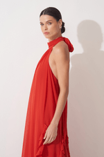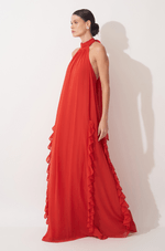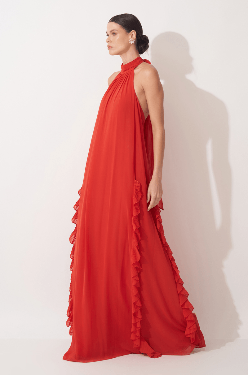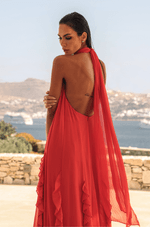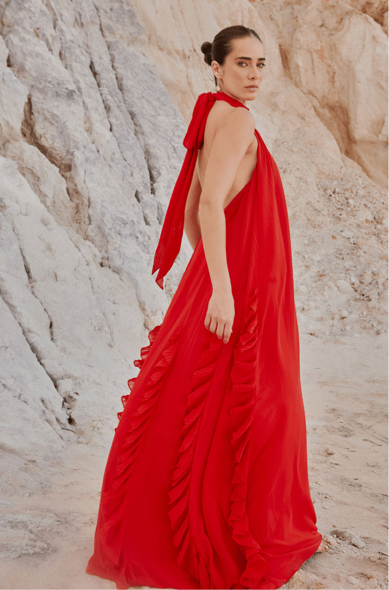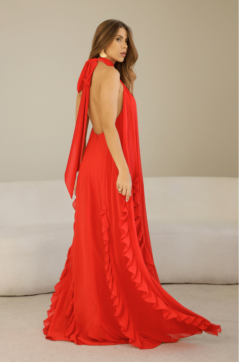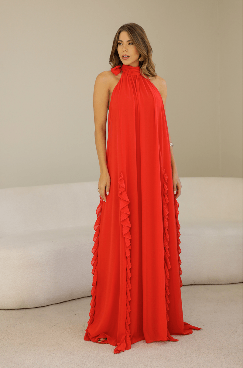 Longo em chiffon leve, com aquela fluidez que acompanha cada movimento e cria um visual etéreo do busto até a barra. O decote nadador com gola alta plissada adiciona um toque moderno e sofisticado, enquanto a faixa plissada que nasce da gola permite uma amarração charmosa, elevando ainda mais o look. A modelagem solta, sem marcação na cintura, ganha destaque com os recortes verticais adornados por babados plissados, que alongam a silhueta e criam um efeito visual refinado. Nas costas, o zíper invisível garante um acabamento impecável. Ideal para madrinhas em casamentos diurnos, ao ar livre ou na praia ¿ uma escolha leve, elegante e cheia de presença. Detalhes da Peça: - Vestido longo em chiffon - Decote nadador com gola alta plissada - Faixa plissada para amarração no pescoço - Modelagem solta e sem cintura marcada - Recortes verticais com babados plissados - Decote profundo nas costas - Zíper invisível nas costas #DicaAmiga: Aposte em brincos longos ou iluminados para acompanhar a gola alta e deixe o cabelo preso ou semi preso para destacar o decote das costas. Sandálias delicadas e acessórios minimalistas completam o look com elegância, perfeito para quem busca presença com leveza.