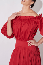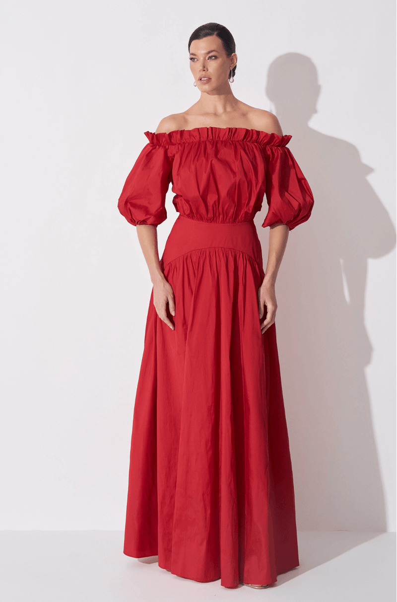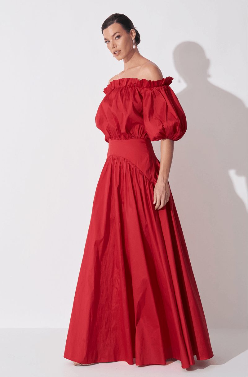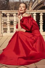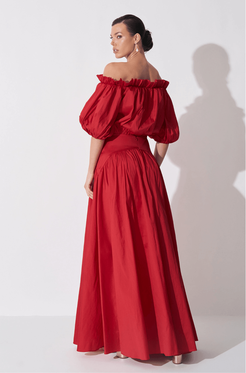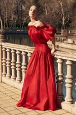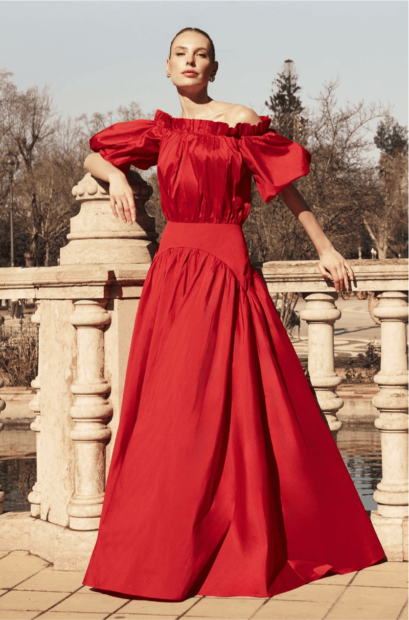 Vestido longo confeccionado em tafetá, com estrutura marcante e visual impactante. O decote ombro a ombro com elástico é realçado por um babado superior que traz romantismo à peça. As mangas curtas bufantes adicionam delicadeza e um toque dramático na medida certa. O busto e a cintura com efeito blusê e franzidos garantem um caimento confortável e elegante. A pala lisa arredondada no quadril valoriza a silhueta, enquanto a saia ampla com recorte franzido oferece fluidez ao caminhar. Nas costas, detalhe em gota com botão personalizado e fechamento por zíper invisível lateral completam o acabamento.