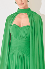 O vestido longo em chiffon traduz leveza e romantismo em cada detalhe. Confeccionado em tecido fluido e esvoaçante, apresenta transparência sutil que realça o movimento e adiciona um toque etéreo ao visual. O decote coração tomara que caia, com franzidos delicados, valoriza o busto de forma charmosa e feminina. Os recortes plissados na cintura e no quadril desenham a silhueta com elegância, garantindo um caimento refinado e equilibrado. A saia ampla cria um visual leve e envolvente, enquanto o zíper invisível nas costas oferece um acabamento limpo e confortável. Acompanha capa removível com gola alta franzida e mangas longas, ideal para compor diferentes estilos ¿ do clássico ao contemporâneo ¿, adicionando sofisticação e modernidade à produção. Perfeito para casamentos, formaturas e eventos especiais que pedem um look marcante e elegante. Detalhes da peça: - Tecido chiffon leve e fluido - Decote coração sem alças - Franzido no busto - Recorte plissado na cintura e quadril - Saia rodada - Zíper invisível nas costas - Capa removível com gola alta e mangas longas #DicaAmiga: Use com brincos longos e cabelos presos para destacar o decote. Com a capa, o look ganha um ar de realeza moderna, sem ela revela uma feminilidade clássica.