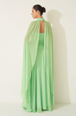 Vestido longo em chiffon leve e esvoaçante, com transparência sutil que confere romantismo e movimento a cada passo. O decote coração tomara que caia, delicadamente franzido, valoriza o busto com charme e feminilidade. O recorte plissado na cintura e no quadril destaca a silhueta com elegância, criando um caimento fluido e refinado. A saia ampla proporciona movimento etéreo, enquanto o zíper invisível nas costas garante um acabamento impecável. Acompanha capa removível com gola alta franzida e mangas longas, perfeita para adicionar um toque de sofisticação e modernidade ao look.
