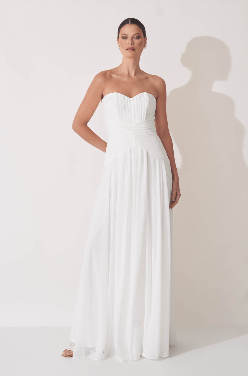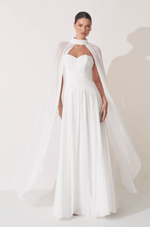 O vestido longo em chiffon traduz leveza e romantismo em cada detalhe. Confeccionado em tecido fluido e esvoaçante, apresenta transparência sutil que realça o movimento e adiciona um toque etéreo ao visual. O decote coração tomara que caia, com franzidos delicados, valoriza o busto de forma charmosa e feminina. Os recortes plissados na cintura e no quadril desenham a silhueta com elegância, garantindo um caimento refinado e equilibrado. A saia ampla cria um visual leve e envolvente, enquanto o zíper invisível nas costas oferece um acabamento limpo e confortável. Acompanha capa removível com gola alta franzida e mangas longas, ideal para compor diferentes estilos ¿ do clássico ao contemporâneo ¿, adicionando sofisticação e modernidade à produção. Perfeito para casamentos, formaturas e eventos especiais que pedem um look marcante e elegante. Detalhes da peça: - Tecido chiffon leve e fluido - Decote coração sem alças - Franzido no busto - Recorte plissado na cintura e quadril - Saia rodada - Zíper invisível nas costas - Capa removível com gola alta e mangas longas #DicaAmiga: Use com brincos longos e cabelos presos para destacar o decote. Com a capa, o look ganha um ar de realeza moderna, sem ela revela uma feminilidade clássica.