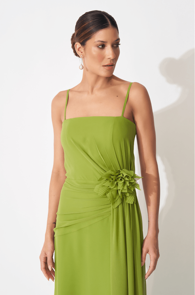 Descubra a delicadeza do vestido longo em chiffon leve, com alças finas e decote reto que realça a elegância feminina. O efeito franzido valoriza a cintura e o quadril, proporcionando um caimento impecável e sofisticado.