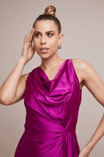 Elegante e fluido, este vestido longo em cetim une sofisticação e leveza em cada detalhe. O decote degagê valoriza o colo com caimento natural e toque sutil, enquanto as pregas estrategicamente posicionadas criam movimento refinado ao caminhar.