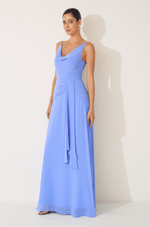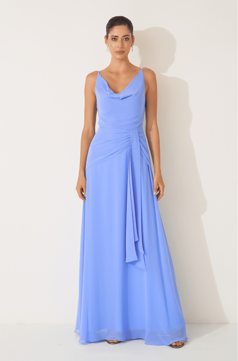 Este vestido longo em chiffon leve destaca-se pelo caimento fluido e elegante, perfeito para ocasiões que pedem delicadeza e sofisticação. O decote degagê valoriza o colo com um toque de requinte, enquanto a cintura marcada pelo franzido no quadril cria uma silhueta feminina e harmoniosa.