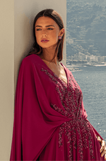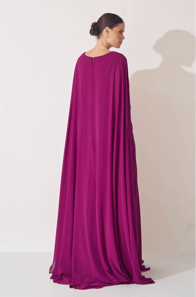 Com comprimento longo e caimento fluido, este vestido em chiffon encanta pelo movimento leve e sofisticado. O decote V alonga a silhueta, enquanto as mangas amplas conferem um efeito capa esvoaçante, reforçando a elegância da peça.