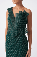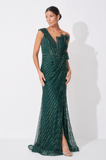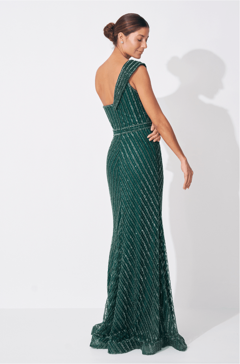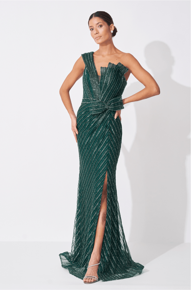 Exale elegância e modernidade com este vestido longo em tule bordado, que combina brilho sutil e textura refinada para um visual impecável. O decote profundo com estrutura interna valoriza o colo, enquanto o design de ombro único acrescenta um toque contemporâneo e sofisticado.
