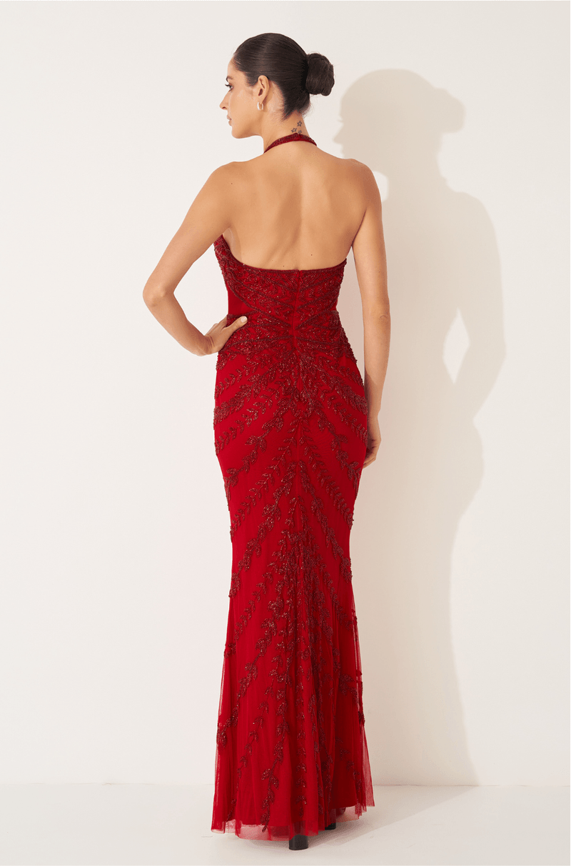 Vestido longo em tule bordado, que une intensidade e sofisticação em cada detalhe. O modelo traz decote frente única com transparência central, revelando o colo de forma ousada e elegante. As costas abertas reforçam a sensualidade, em contraste com a modelagem ajustada que valoriza a silhueta. Os bordados em arabesco se espalham em direção à barra, criando movimento e imponência. Ideal para madrinhas em casamentos noturnos ou convidadas em festas de gala. Detalhes da peça: - Vestido longo em tule bordado - Decote frente única com recorte e transparência - Costas abertas - Bordados em arabesco que alongam a silhueta - Modelagem ajustada ao corpo #DicaAmiga: Complete o look com um coque baixo ou sleek hair para destacar o decote e aposte em acessórios minimalistas em dourado ou preto para equilibrar o brilho do bordado,