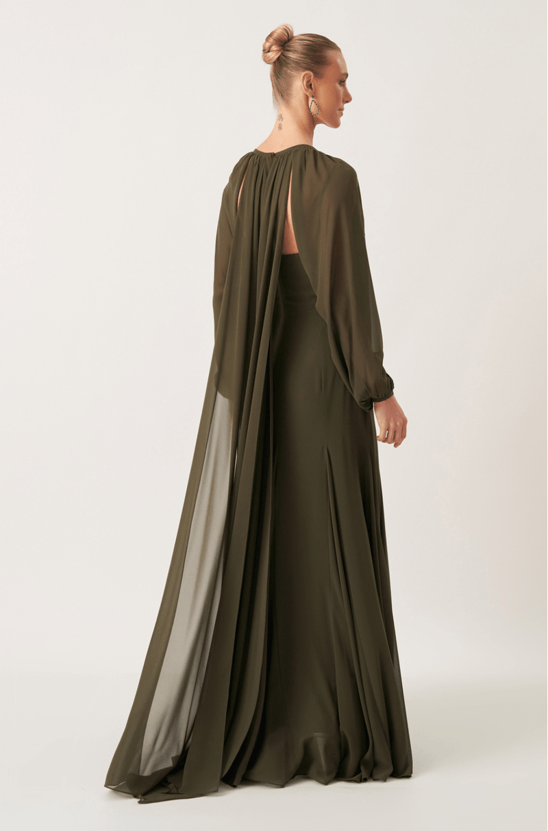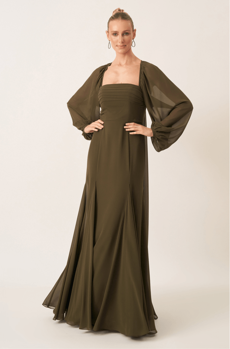 Delicado e versátil, este vestido longo fluido em chiffon garante leveza e movimento em cada detalhe. O decote reto com pregas no busto valoriza o colo com sutileza, enquanto a saia sereia com nesgas proporciona um caimento encantador, perfeito para caminhar ou dançar com elegância. O grande diferencial da peça está nas mangas longas bufantes com capa alongada removíveis, que permitem duas propostas distintas: uma opção sofisticada e coberta para eventos em dias frios, e outra mais leve e fresca para ocasiões em climas quentes. Ideal para casamentos, formaturas e eventos especiais, este vestido oferece romantismo, funcionalidade e estilo em um só look. Detalhes da Peça - Decote reto com pregas - Mangas bufantes com capa removíveis - Ajustado na cintura e quadril - Saia sereia com nesgas - Zíper invisível nas costas #DicaAmiga: escolha penteados presos ou que tragam destaque para o rosto e experimente um brinco delicado mas com presença enquanto deixa o colo livre para trazer equilíbrio para uma produção encantadora!