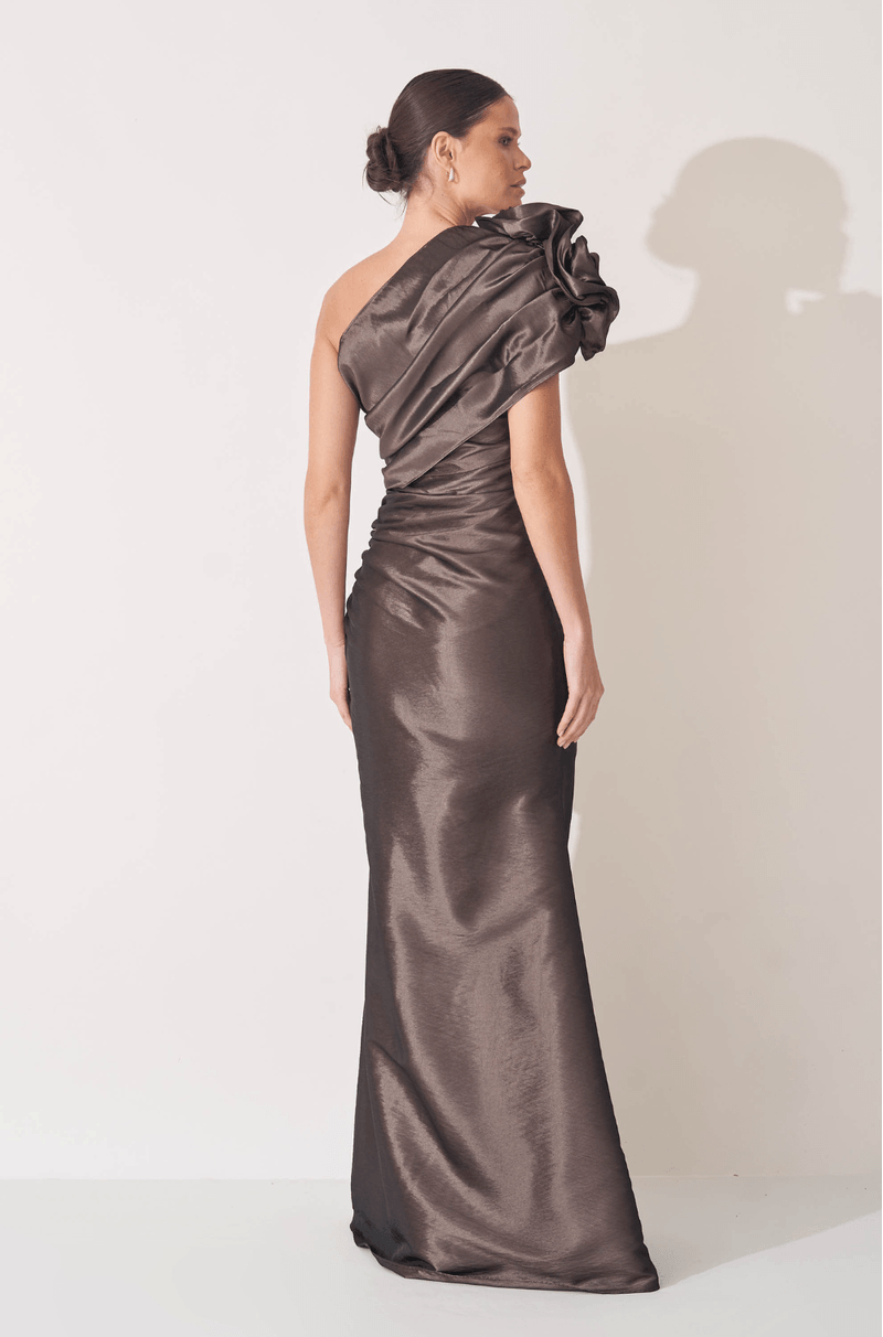 Este vestido longo em tafetá une brilho sutil e estrutura elegante para um visual sofisticado e marcante. Apresenta decote ombro único, complementado por manga franzida com volume bufante, que adiciona charme e personalidade à peça.