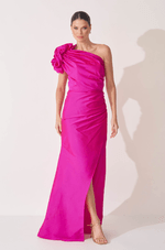 Este vestido longo em tafetá une brilho sutil e estrutura elegante para um visual sofisticado e marcante. Apresenta decote ombro único, complementado por manga franzida com volume bufante, que adiciona charme e personalidade à peça.