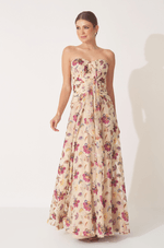 Vestido longo em viscose devorê estampada, leve e sofisticado. O decote coração sem alças valoriza o colo de forma romântica, enquanto o franzido no centro da cintura garante caimento elegante. A faixa solta com ponta assimétrica adiciona movimento e um detalhe fashion ao look. A saia solta transmite fluidez, complementada pelo franzido nas costas e fechamento com zíper invisível. Uma escolha perfeita para quem busca feminilidade com toque moderno em casamentos ao ar livre e eventos especiais.