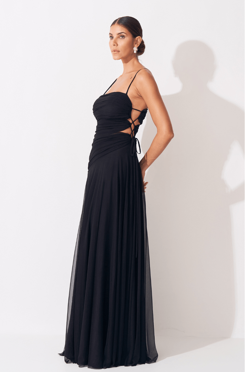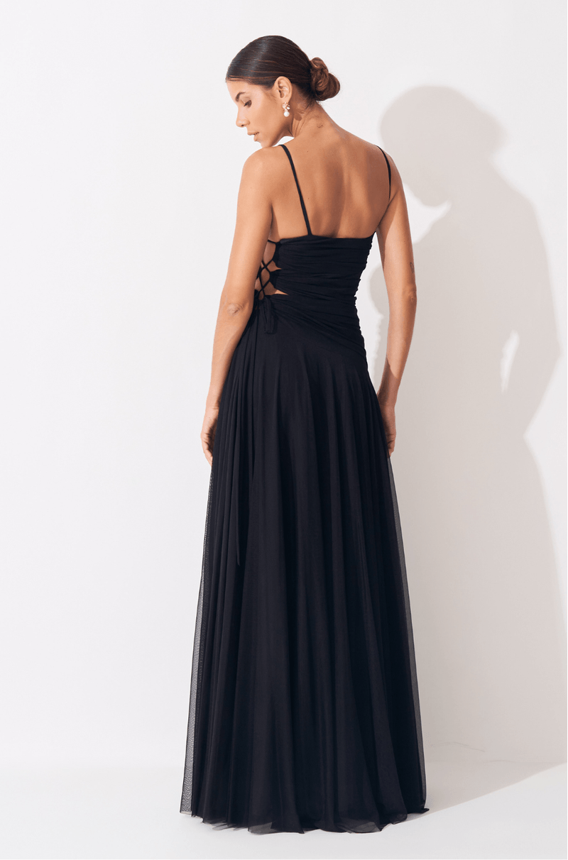Encante-se com o vestido longo em tule que proporciona uma leveza etérea e fluidez ao visual. O decote delicado, sustentado por alças finas, valoriza o colo com elegância e suavidade.