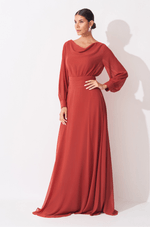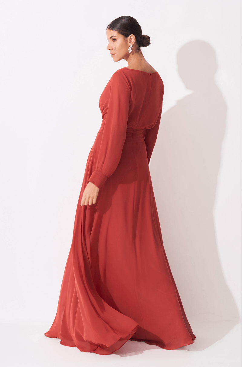 Romântico e sofisticado, este vestido longo em chiffon é a escolha perfeita para quem busca leveza e elegância em ocasiões especiais. O tecido fluido proporciona movimento delicado ao caminhar, criando um visual etéreo e extremamente feminino.