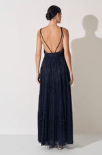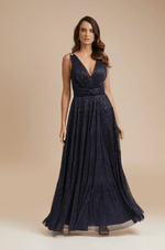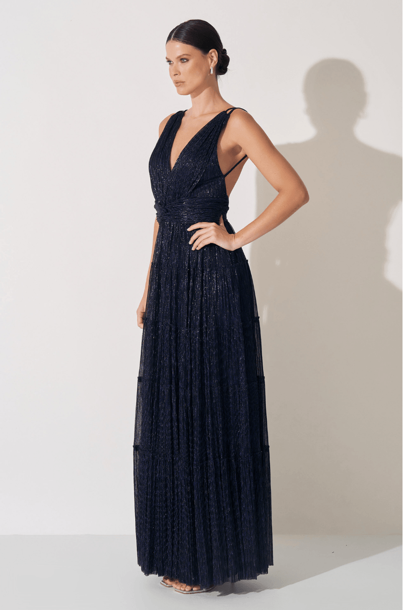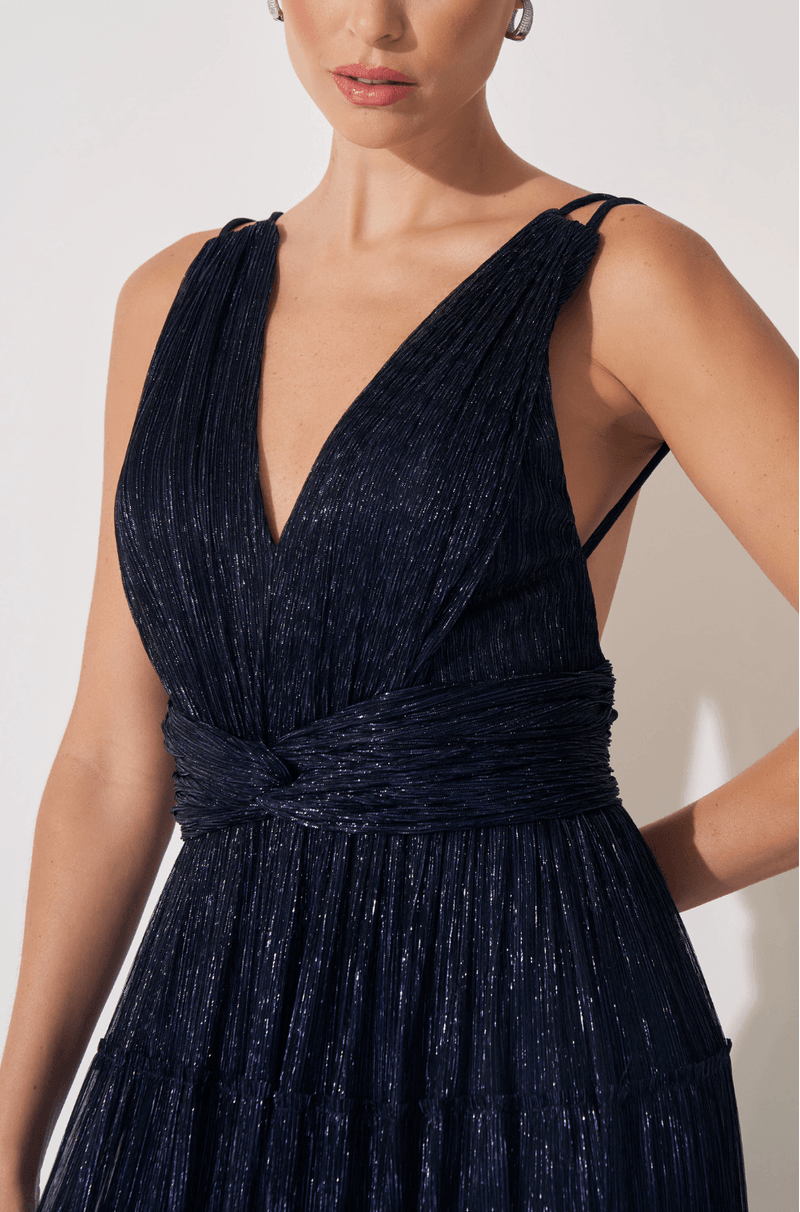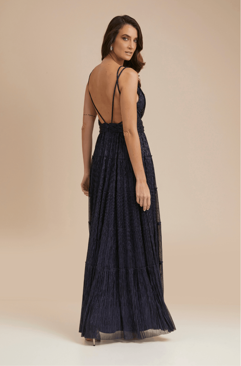 Encante em ocasiões especiais com este vestido longo confeccionado em tecido leve com fios de lurex, que proporcionam um efeito luminoso sutil e sofisticado. O busto plissado valoriza a região com um toque refinado, enquanto a faixa cruzada na cintura realça as formas, criando uma silhueta feminina e elegante.