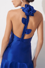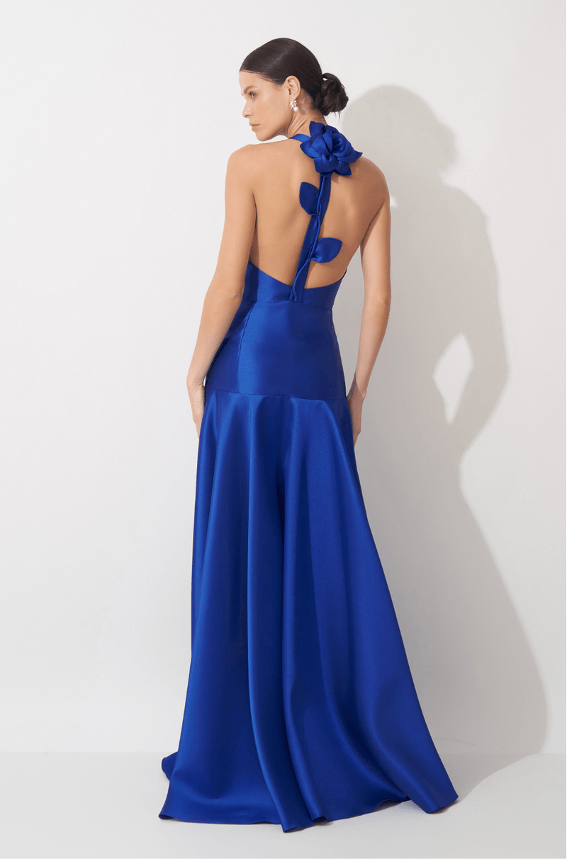 Vestido longo em zibeline, estruturado e imponente, que valoriza a silhueta com elegância arquitetônica. O decote frente única com alça larga e botão personalizado na gola alonga a linha do colo com sofisticação. Nas costas, o decote profundo ganha ainda mais destaque com a aplicação de flor em zibeline cortada a laser, um detalhe delicado e artístico que transforma a peça em protagonista. A cintura é marcada por recorte vertical que desenha a silhueta com precisão. A saia segue reta até o quadril e se abre suavemente em recorte arredondado, criando um caimento elegante e equilibrado. Ideal para eventos formais, casamentos noturnos e ocasiões que pedem presença marcante.
