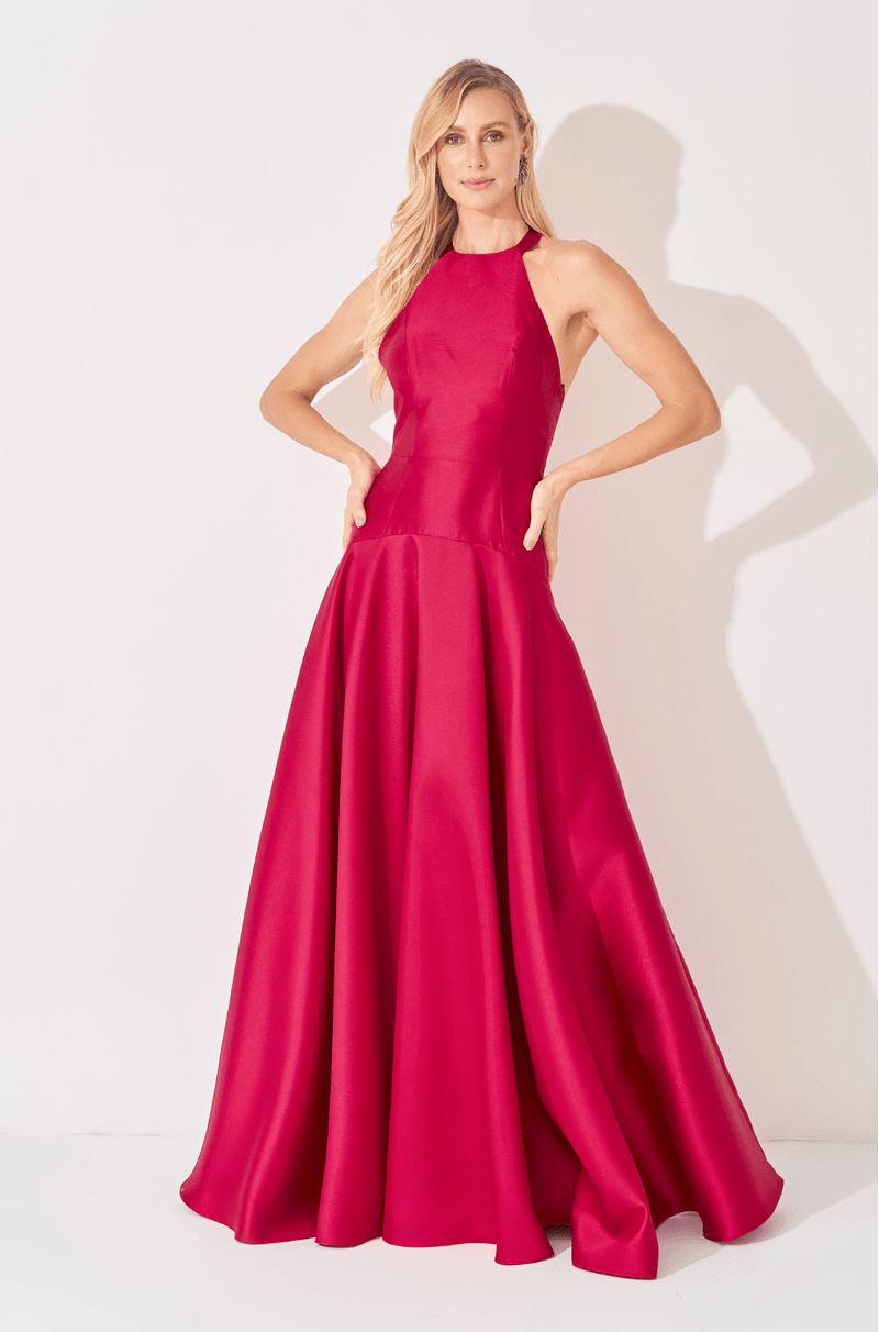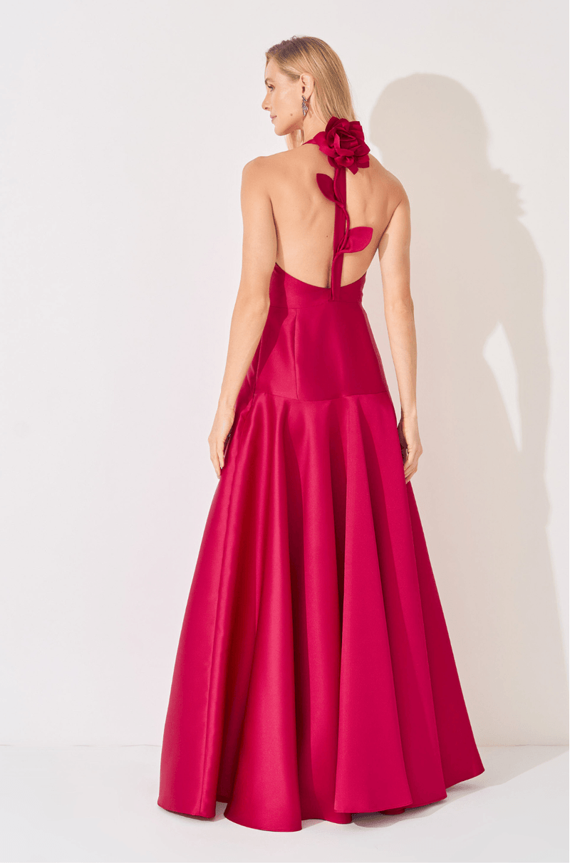 Vestido longo em zibeline, estruturado e imponente, que valoriza a silhueta com elegância arquitetônica. O decote frente única com alça larga e botão personalizado na gola alonga a linha do colo com sofisticação. Nas costas, o decote profundo ganha ainda mais destaque com a aplicação de flor em zibeline cortada a laser, um detalhe delicado e artístico que transforma a peça em protagonista. A cintura é marcada por recorte vertical que desenha a silhueta com precisão. A saia segue reta até o quadril e se abre suavemente em recorte arredondado, criando um caimento elegante e equilibrado. Ideal para eventos formais, casamentos noturnos e ocasiões que pedem presença marcante.