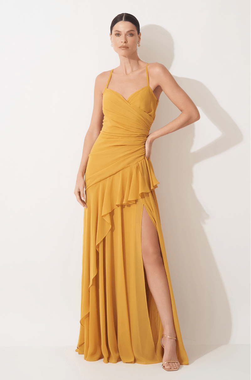 Este longo em chiffon esvoaçante traduz leveza com impacto visual, criando um movimento fluido que encanta a cada passo. O decote transpassado apresenta franzidos delicados no busto, moldando o colo com naturalidade e conferindo um charme romântico na medida certa. A cintura e o início do quadril são marcados de forma suave, equilibrando as proporções e preparando o olhar para a saia rodada com fenda frontal, que adiciona modernidade e um toque de sensualidade elegante. O babado diagonal que nasce no quadril e acompanha toda a extensão da barra intensifica a fluidez do modelo, criando um efeito dinâmico e sofisticado. Ideal para festas formais, garden weddings e eventos noturnos que pedem presença, movimento e feminilidade em perfeita harmonia. Detalhes da peça: - Chiffon leve - Decote transpassado com franzidos - Fenda frontal - Babado diagonal do quadril à barra - Saia rodada fluida - Zíper invisível na lateral #DicaAmiga: Sandálias de tiras finas deixam o look ainda mais leve. Se quiser reforçar o ar romântico, aposte em acessórios perolados ou em penteados com ondas suaves.