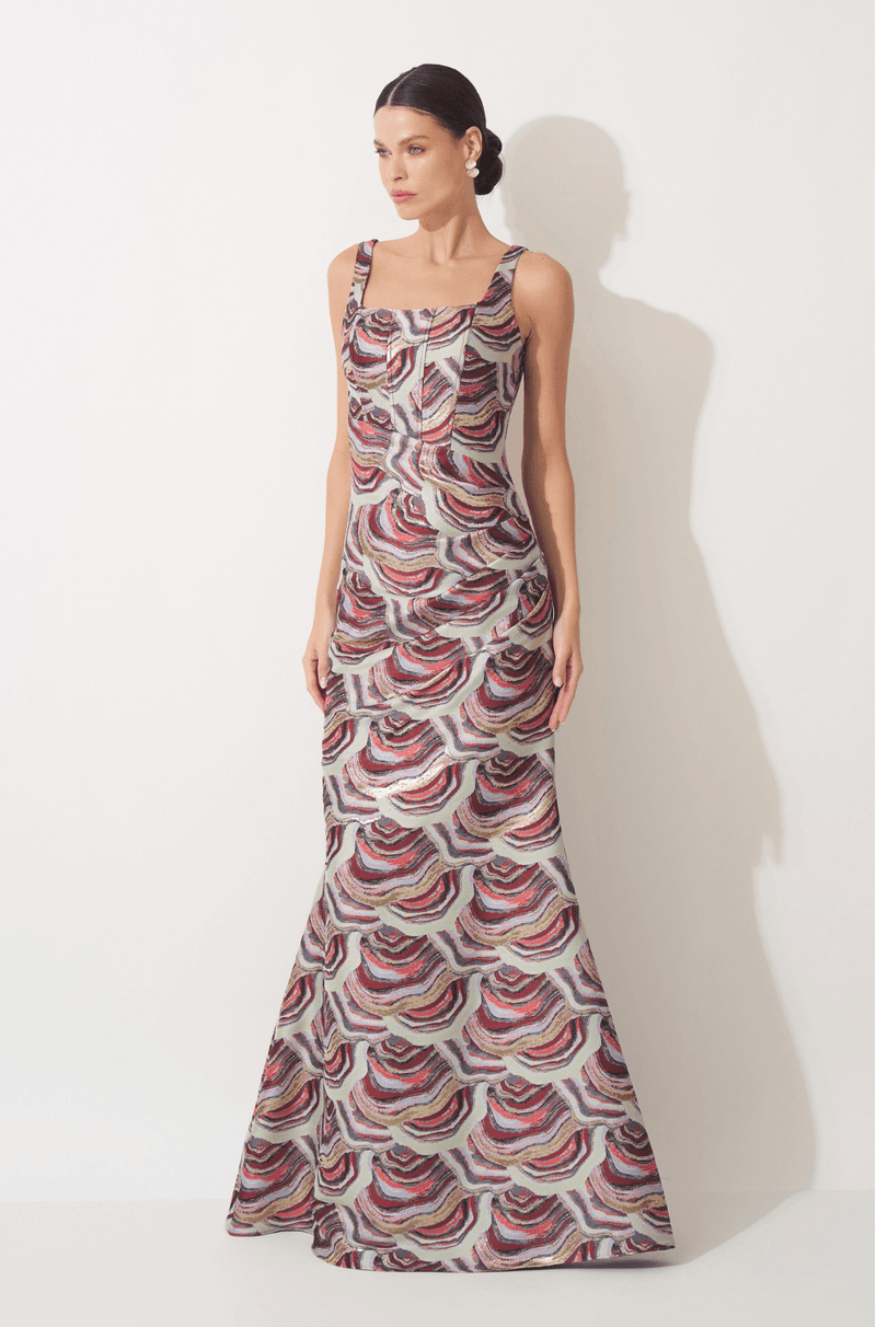 O decote quadrado com alças finas traz um toque moderno e feminino, enquanto o busto e a cintura estruturados com barbatanas garantem sustentação e desenho preciso do corpo. As pregas que partem do recorte diagonal da cintura até o quadril criam um efeito visual alongado e refinado. A saia sereia acrescenta imponência e movimento, e o zíper invisível no centro das costas finaliza a peça com acabamento limpo e sofisticado.