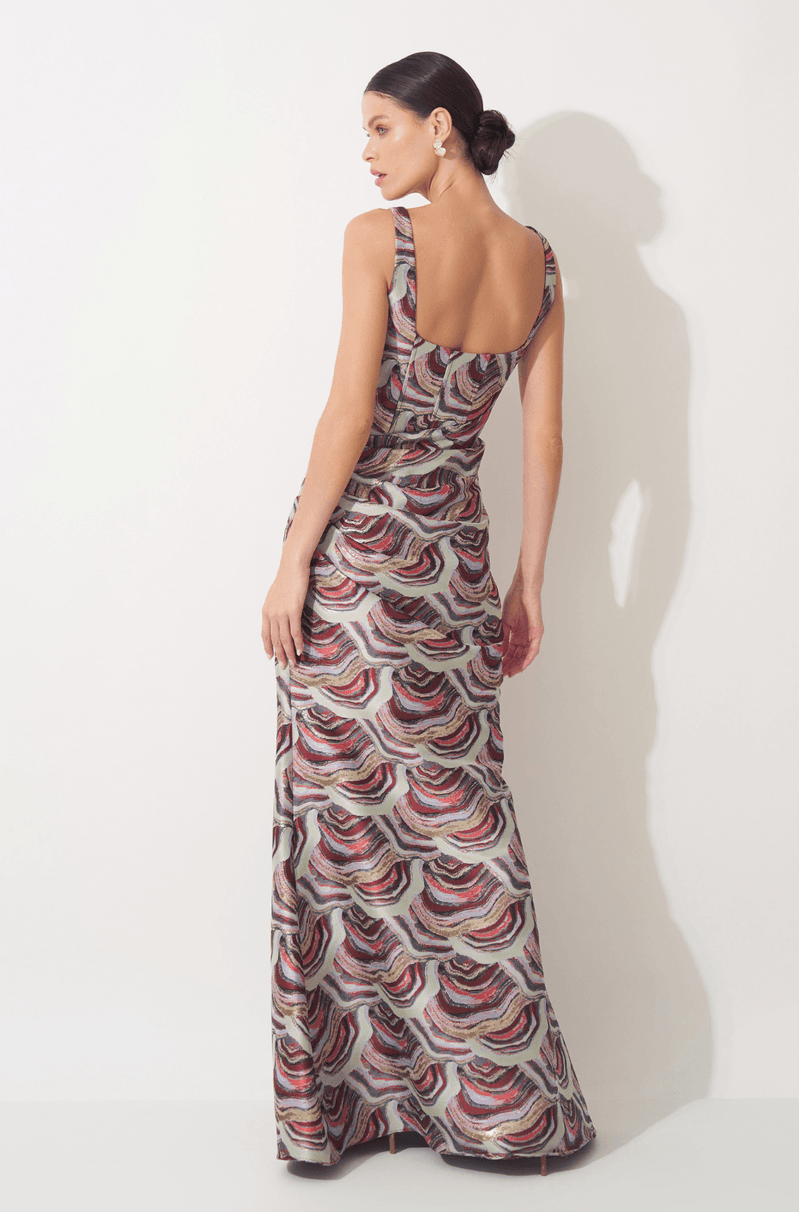 Aposte em acessórios lisos e minimalistas para equilibrar a riqueza do jacquard. Sandálias delicadas e clutch neutra deixam o look elegante e harmônico.