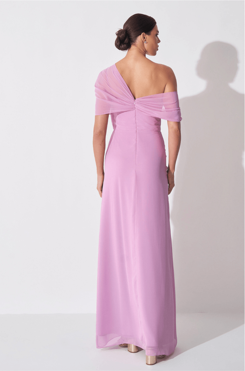 Vestido longo em chiffon com caimento leve e toque esvoaçante. A modelagem ombro único ganha destaque com drapeados que criam um efeito envolvente sobre o busto e a manga caída sobre os ombros. Nas costas, o detalhe franzido adiciona charme ao visual. A cintura é marcada de forma sutil por uma faixa franzida fixa e faixa solta sobreposta até a barra junto da saia longa cai em linha A com fluidez elegante. Ideal para casamentos ao ar livre, madrinhas ou eventos com dress code sofisticado.